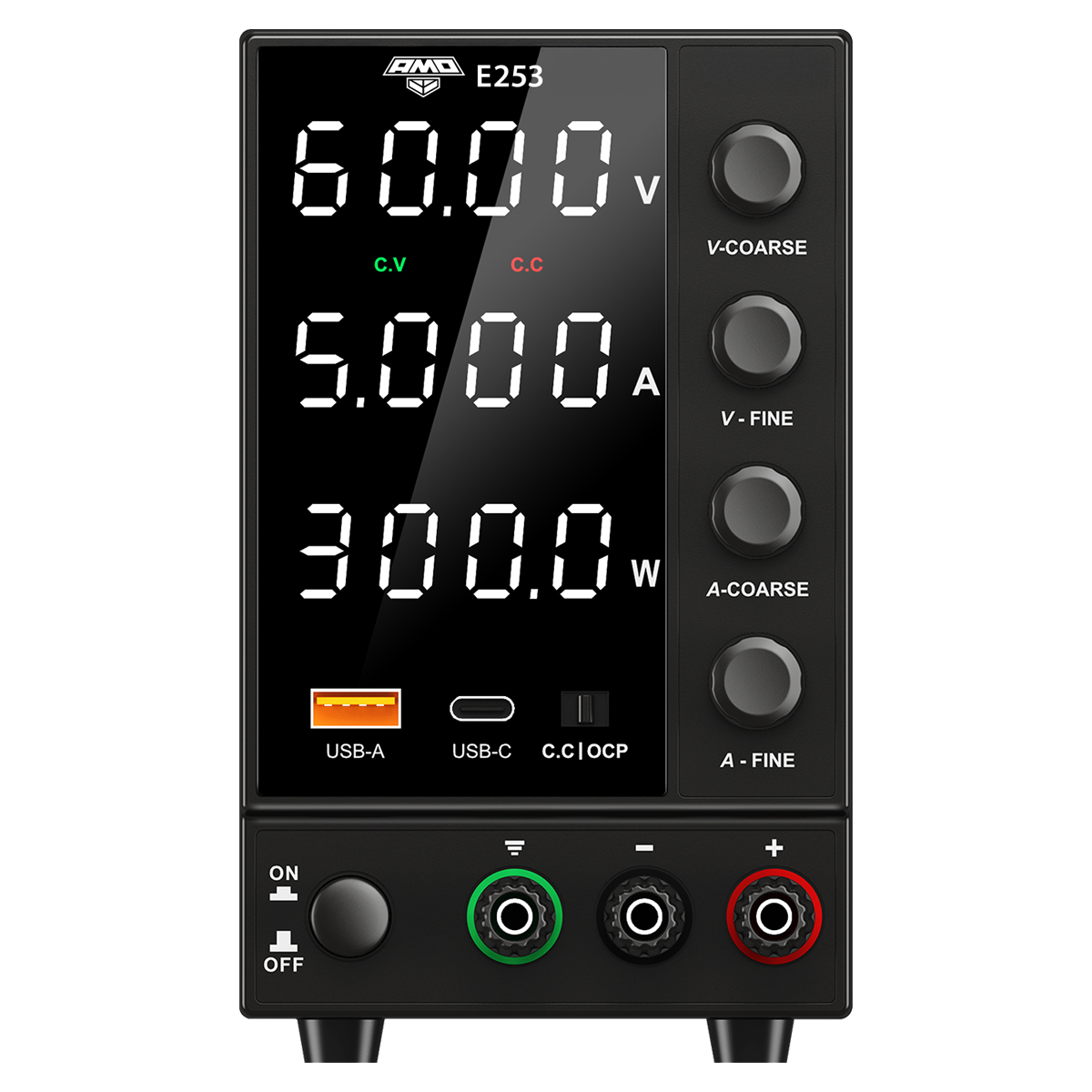 - Источник питания постоянного тока AMO E253 автоматически переключается между режимами стабилизации напряжения (CV) и стабилизации тока (CC).