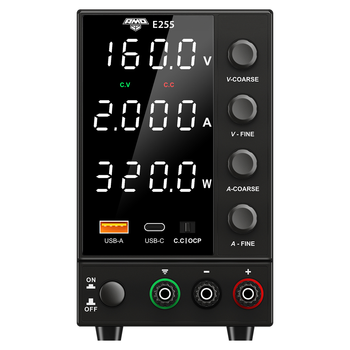 - AMO E255 автоматически переключается между режимом стабилизации напряжения (CV) и стабилизации тока (CC) в зависимости от поведения нагрузки.