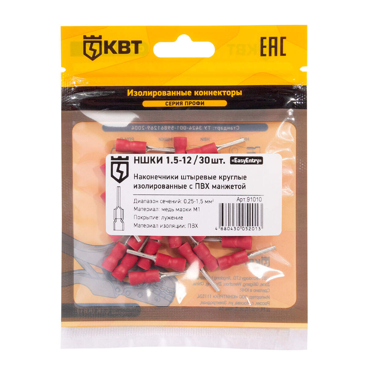 Наконечник кабельный штыревой круглый изолированный НШКИ 1.5–12 (30 шт) (КВТ) 91010 - предназначены для оконцевания опрессовкой многопроволочных гибких медных проводов и последующего крепежа наконечников к клеммам электрического оборудования на основе винтовой фиксации.
