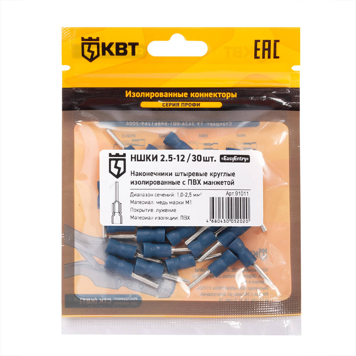Наконечник кабельный штыревой круглый изолированный НШКИ 2.5–12 (30 шт) (КВТ) 91011 - предназначены для оконцевания опрессовкой многопроволочных гибких медных проводов и последующего крепежа наконечников к клеммам электрического оборудования на основе винтовой фиксации.