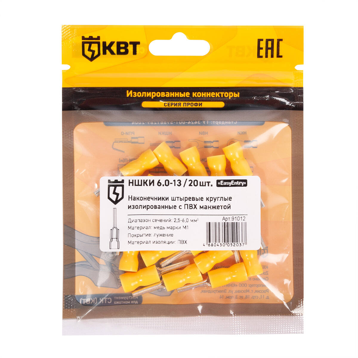 Наконечник кабельный штыревой круглый изолированный НШКИ 6.0–13 (20 шт) (КВТ) 91012 - предназначены для оконцевания опрессовкой многопроволочных гибких медных проводов и последующего крепежа наконечников к клеммам электрического оборудования на основе винтовой фиксации.