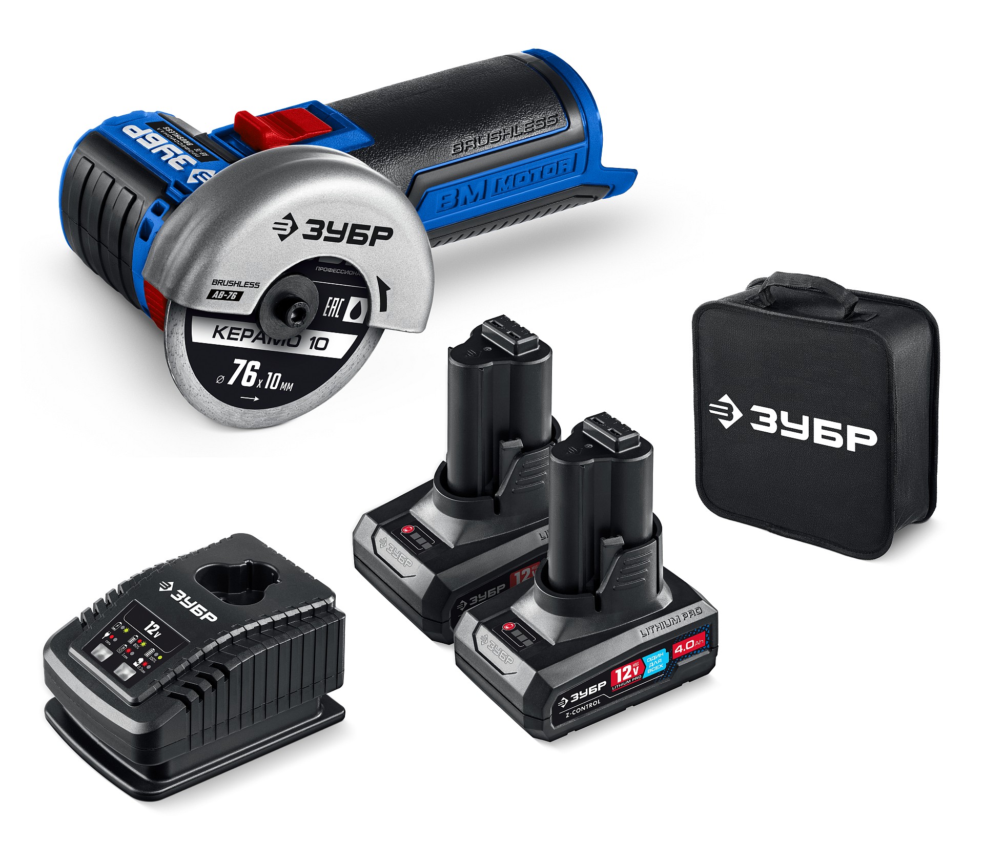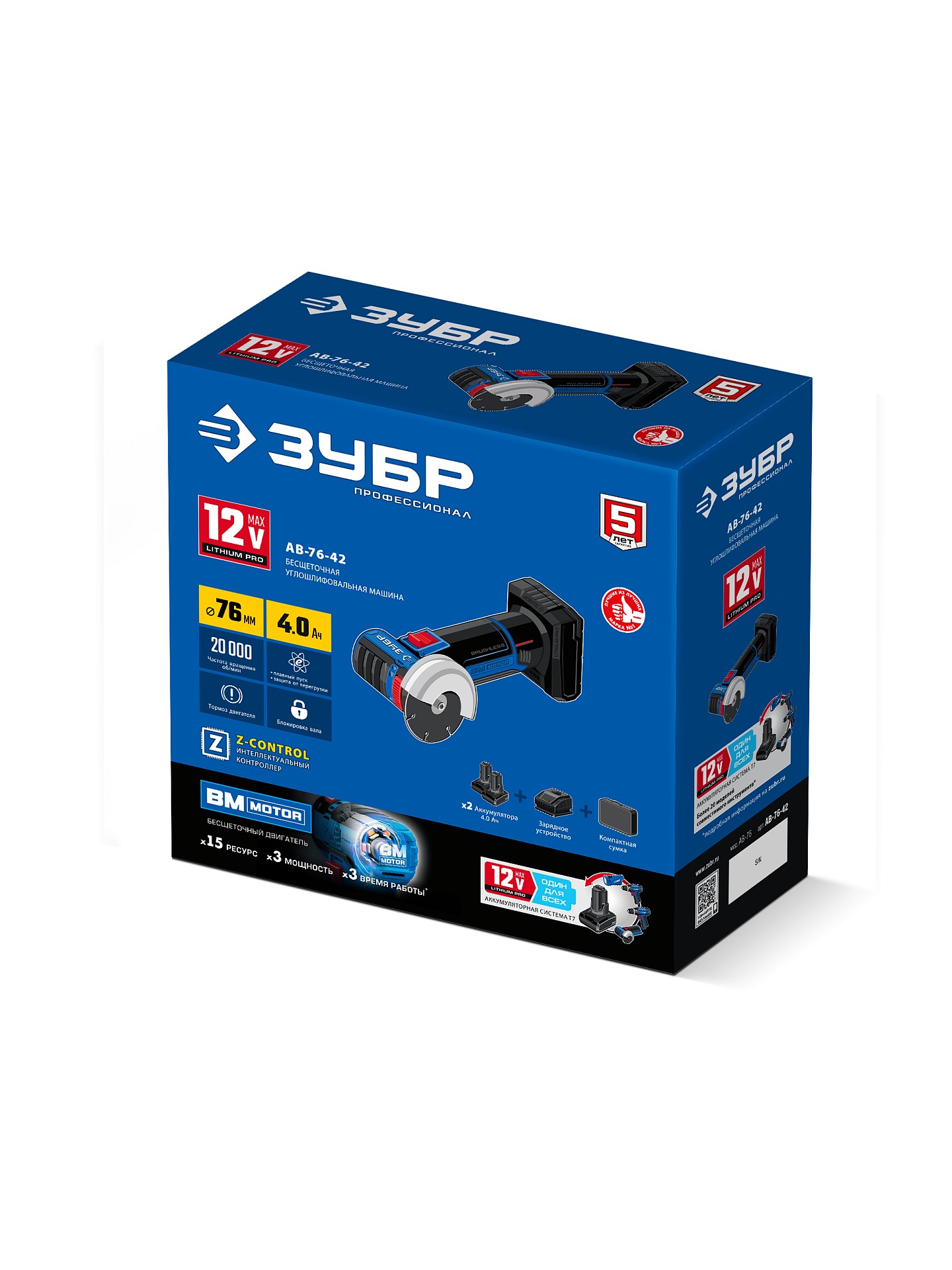 Бесщеточная УШМ ЗУБР 12 В, D76 мм, 2 АКБ тип Т7 (4 А·ч), сумка, Профессионал AB-76-42 - предназначена для зачистки, шлифовки и резки металлов, обработки бетона и камня при установке соответствующих шлифовальных, отрезных, алмазных кругов.