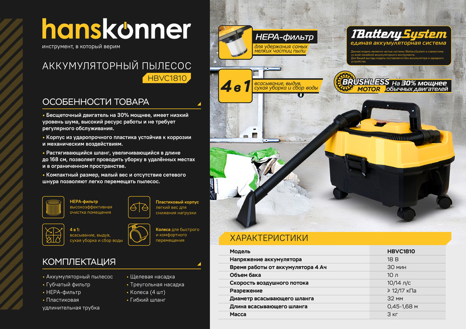Аккумуляторный пылесос Hanskonner HBVC1810 предназначен для всасывания сухого строительного и бытового мусора, влажной уборки и сбора воды, а также обдува с высоким потоком воздуха.