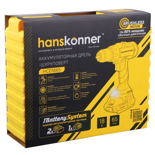 Аккумуляторная бесщеточная дрель-шуруповерт Hanskonner HCD1865 подходит для любых работ, в том числе в стесненных условиях и труднодоступных местах без снижения производительности и потери качества работ.