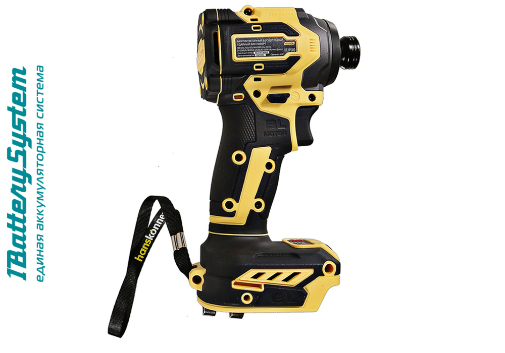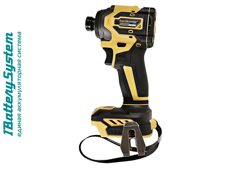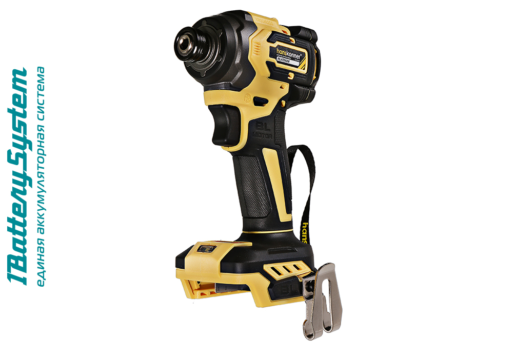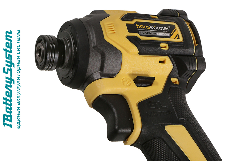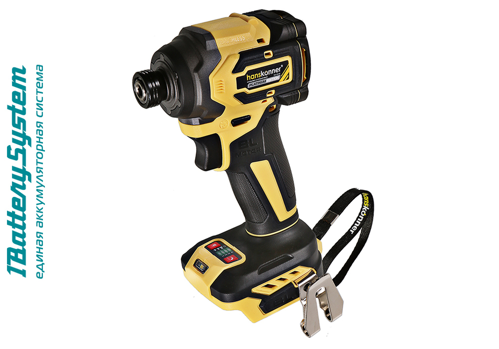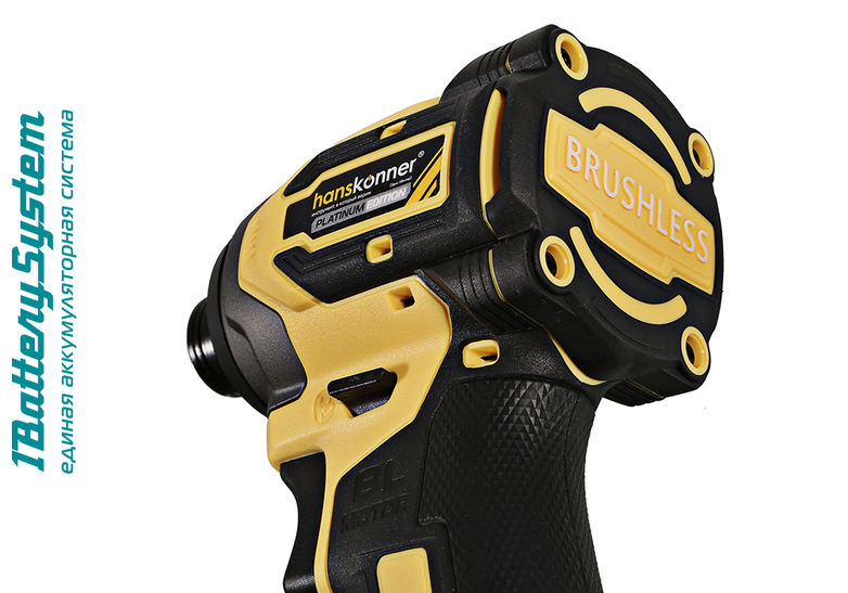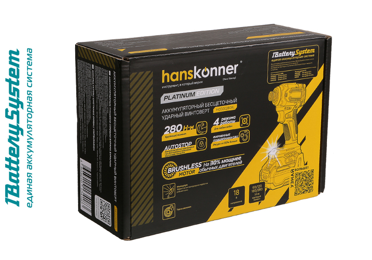 Hanskonner HCD20280BL – аккумуляторный 18 В, ударный винтоверт с типом гнезда под шестигранник 1/4 ″ – является частью системы 1BatterySystem, обеспечивающей совместимость одного и того же аккумулятора с целым рядом наименований инструмента. Модель обладает максимально сбалансированной компоновкой: небольшие размеры корпуса и рукояти позволяют эффективное использование в условиях с затрудненным доступом, а нейтральный центр тяжести, и обилие прорезиненных противоскользящих поверхностей способствуют надежному хвату, и лучшему контролю. Винтоверт оснащен 18 В бесщеточным двигателем, характеризующимся на 30% лучшей производительностью в сравнении с коллекторными аналогами. Кроме того, бесщеточный двигатель отлично справляется с кратковременными перегрузками и не склонен к перегреву. Благодаря применению мощного планетарного механизма, Hanskonner HCD20280BL уверенно демонстрирует высокие показатели крутящего момента (до 280 Н м), что позволяет работать с крепежом большой длины и диаметра. Винтоверт имеет четыре режима настройки момента затяжки: 60 Н м, 120 Н м, 180 Н м, 280 Н м – пользователь выбирает нужный, исходя из конкретного материала и крепежа. Модель оснащена функцией AutoStop, плавно останавливающей вал шпинделя сразу после откручивания крепежа. К особенностям Hanskonner HCD20280BL стоит отнести эффективную LED-подсветку рабочей зоны WorkingLight с блоком коллиматорных линз, создающих направленный симметричный луч, а также индикатор остаточного заряда аккумулятора PowerCheck. Дополнительному комфорту использования способствуют специальная зацепная скоба крепления на пояс.