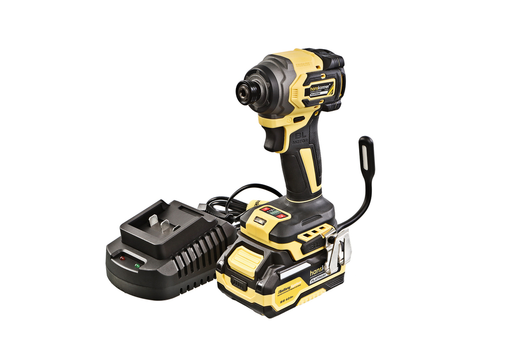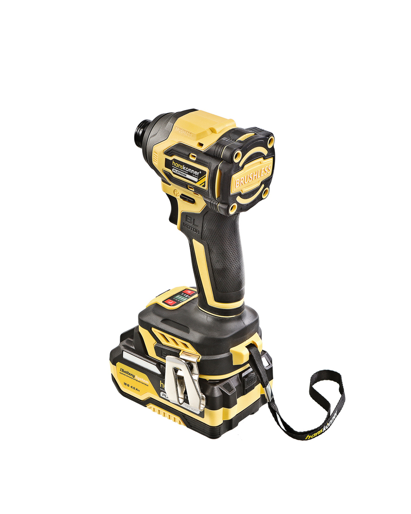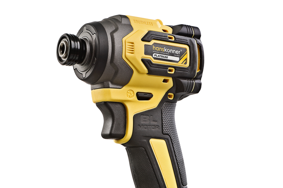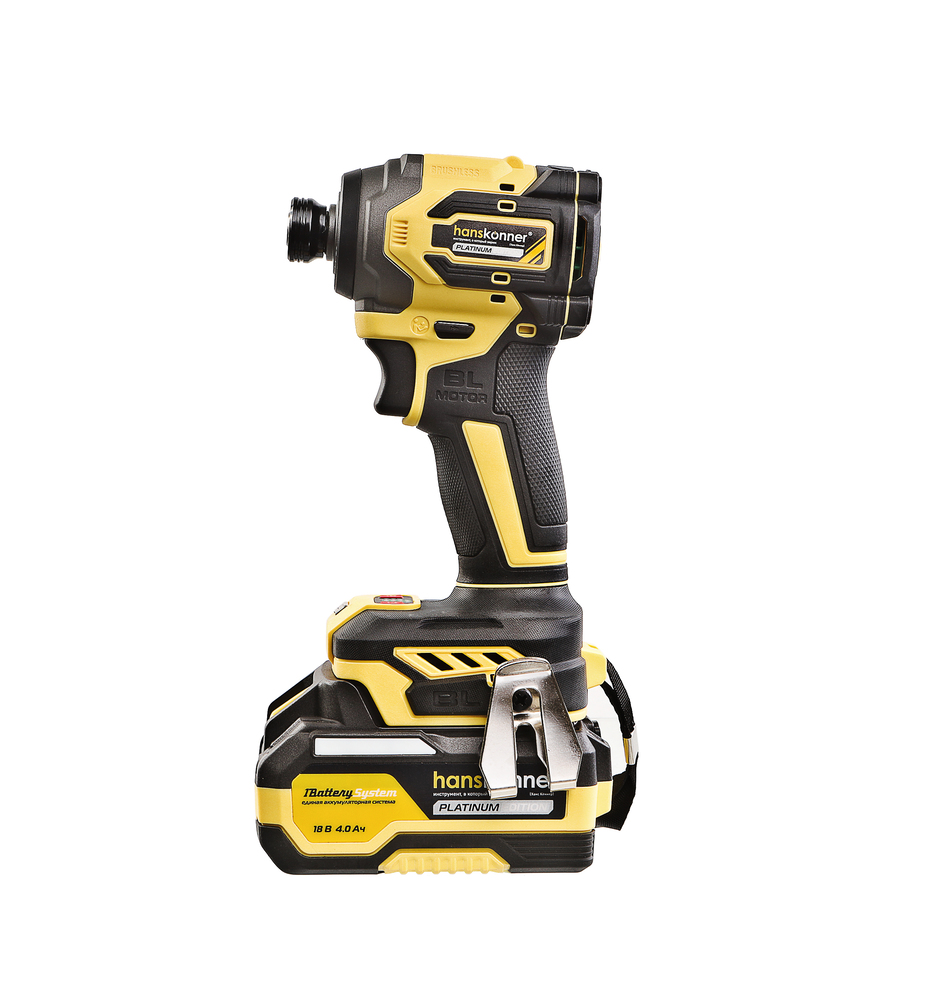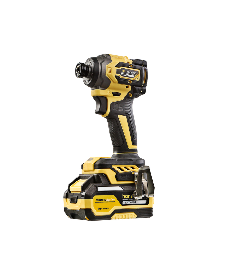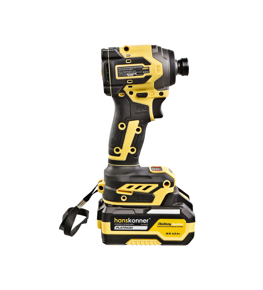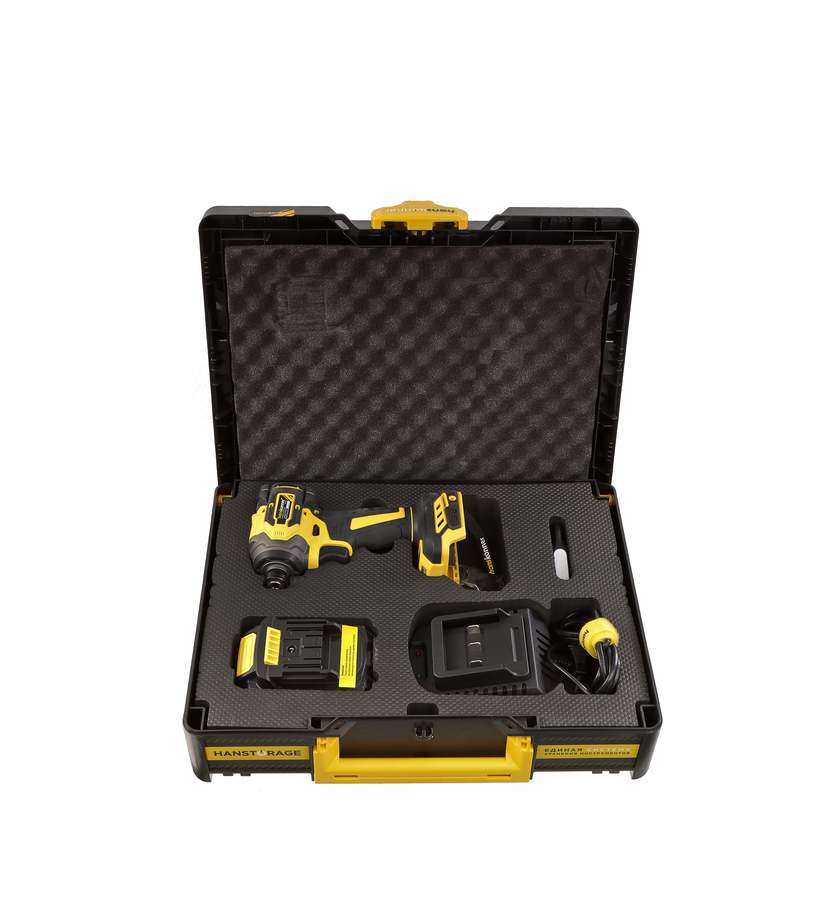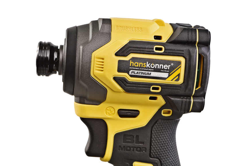 Hanskonner HCD20280BLС – аккумуляторный 18 В, ударный винтоверт с типом гнезда под шестигранник 1/4 ″ – является частью системы 1BatterySystem, обеспечивающей совместимость одного и того же аккумулятора с целым рядом наименований инструмента. Модель обладает максимально сбалансированной компоновкой: небольшие размеры корпуса и рукояти позволяют эффективное использование в условиях с затрудненным доступом, а нейтральный центр тяжести, и обилие прорезиненных противоскользящих поверхностей способствуют надежному хвату, и лучшему контролю. Винтоверт оснащен 18 В бесщеточным двигателем, характеризующимся на 30% лучшей производительностью в сравнении с коллекторными аналогами. Кроме того, бесщеточный двигатель отлично справляется с кратковременными перегрузками и не склонен к перегреву. Благодаря применению мощного планетарного механизма, Hanskonner HCD20280BLС уверенно демонстрирует высокие показатели крутящего момента (до 280 Н м), что позволяет работать с крепежом большой длины и диаметра. Винтоверт имеет четыре режима настройки момента затяжки: 60 Н м, 120 Н м, 180 Н м, 280 Н м – пользователь выбирает нужный, исходя из конкретного материала и крепежа. Модель оснащена функцией AutoStop, плавно останавливающей вал шпинделя сразу после откручивания крепежа. К особенностям Hanskonner HCD20280BLC стоит отнести эффективную LED-подсветку рабочей зоны WorkingLight с блоком коллиматорных линз, создающих направленный симметричный луч, а также индикатор остаточного заряда аккумулятора PowerCheck. Дополнительному комфорту использования способствуют специальная зацепная скоба крепления на пояс и страховочный ремешок на руку. Винтоверт штатно комплектуется литий-ионным (Li-ion) аккумулятором емкостью 4.0 А ч с возможностью подзарядки от него через USB выход сторонних гаджетов, импульсным зарядным устройством, USB LED-фонарем, запитываемым от АКБ. Прочный кейс единой системы хранения инструмента HANSTORAGE гарантирует сохранность устройства и аксессуаров в процессе транспортировки.