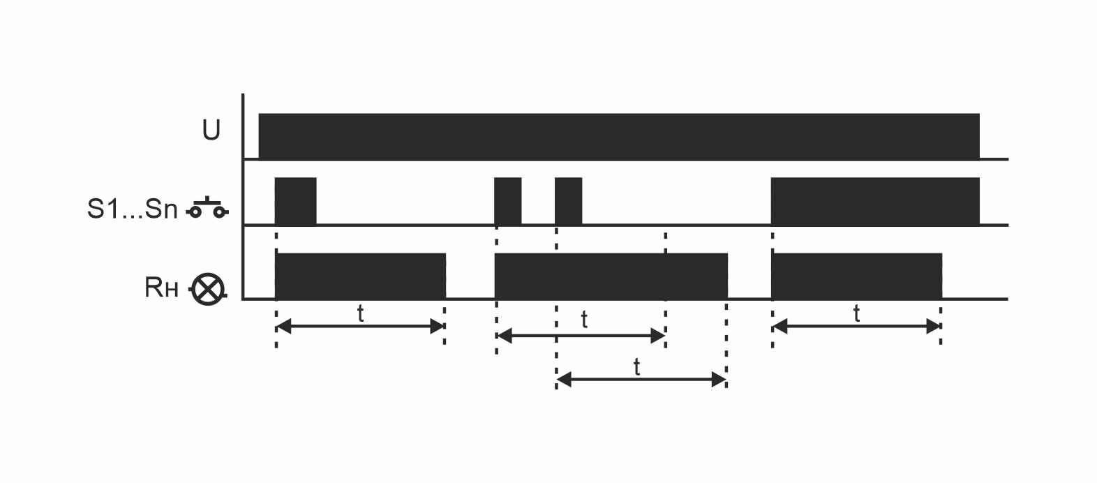 Монтаж на DIN-рейку. Предназначен для отключения освещения или иной нагрузки через заданный промежуток времени после его включения. Принцип работы Включение нагрузки осуществляется подачей электрического импульса на вход управления автомата замыканием любого из выключателей кнопочного типа, параллельно соединенных между собой. Выключение нагрузки происходит автоматически по окончании времени t, установленного регулятором на корпусе автомата в интервале от 0,5 до 10 минут. Подача очередного импульса во время отсчета времени увеличат задержку отключения на время t.