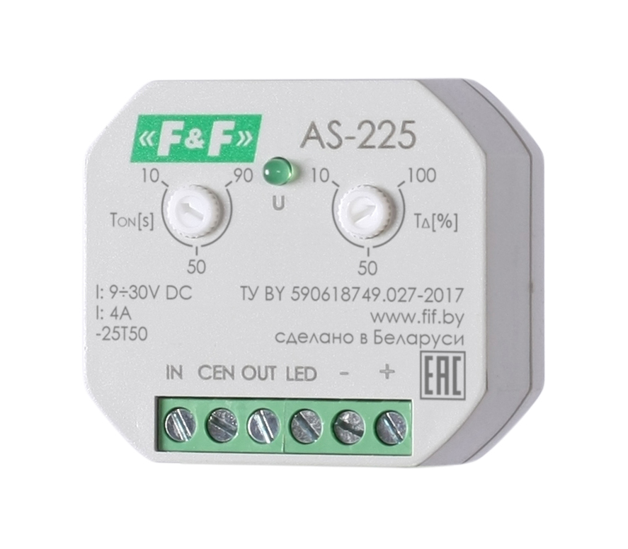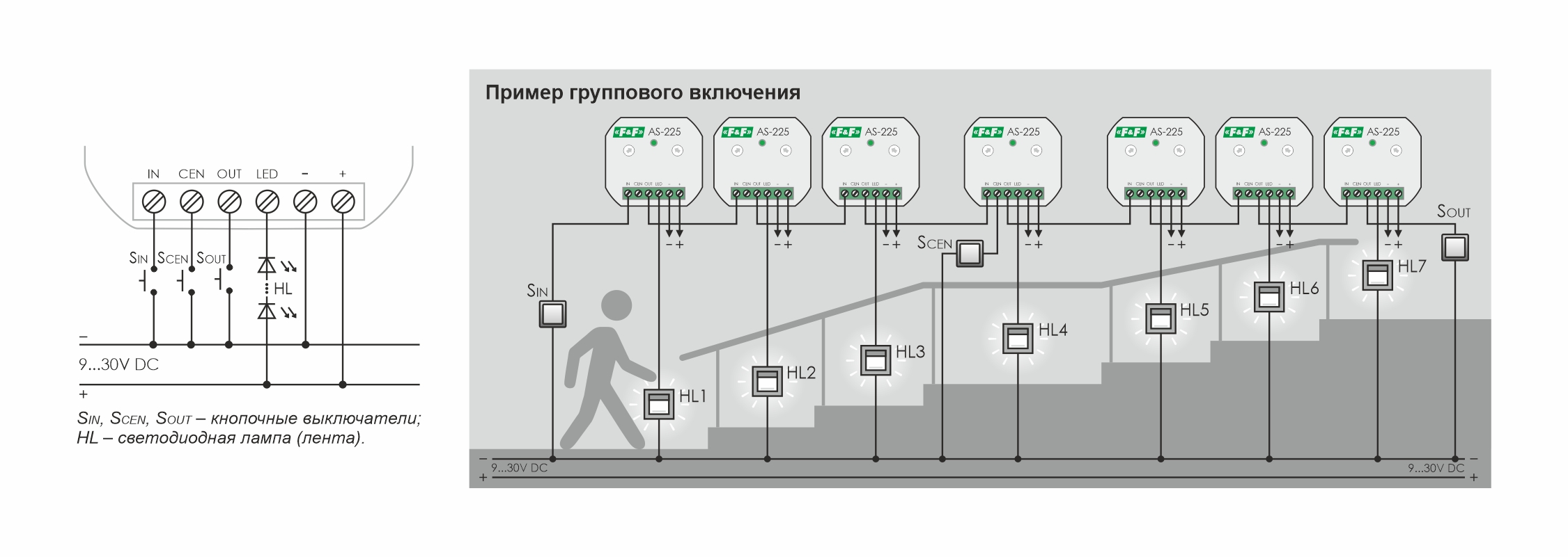 В монтажную коробку. Предназначен для построения системы многоточечного каскадного управления светодиодными лентами и низковольтными диммируемыми LED светильниками, создания световых эффектов, например, «бегущего света» вдоль объектов освещения, таких как лестничные марши, коридоры, тамбуры и т.д. С настраиваемым диапазоном выдержки времени работы в интервале от 10 до 90 секунд. Функция группового режима работы. Напряжение питания 9…30 DC. Максимальный ток нагрузки ≤ 4 А.