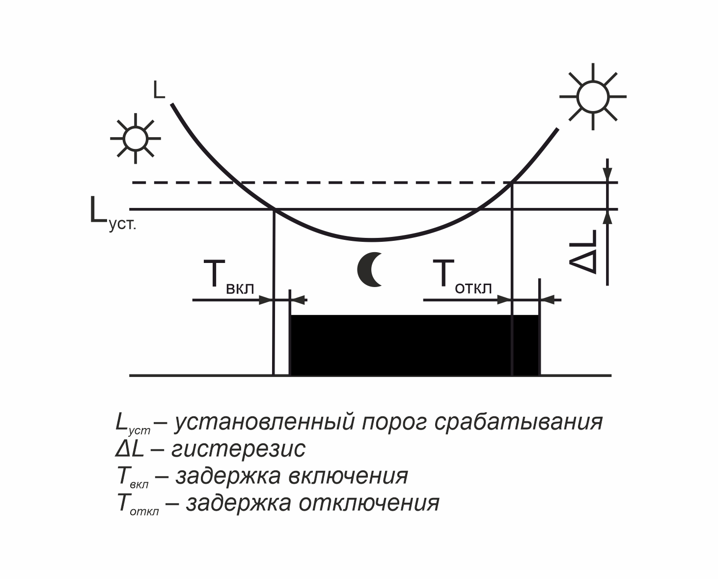 Монтаж на DIN-рейку. Для автоматического включения освещения в сумерки и выключения на рассвете. Принцип работы основан на контроле уровня освещенности выносным фотодатчиком. При снижении уровня освещённости ниже установленного замыкаются контакты реле и включается освещение. При увеличении уровня освещённости контакты размыкаются, освещение выключается. Порог срабатывания реле устанавливается потенциометром. Для защиты от ложных срабатываний при случайном освещении или затемнении фотодатчика предусмотрена задержка времени выключения и включения.Применяется для управления освещением улиц, витрин магазинов, реклам, автостоянок, строек и т.п., а также использования в устройствах промышленной автоматики.