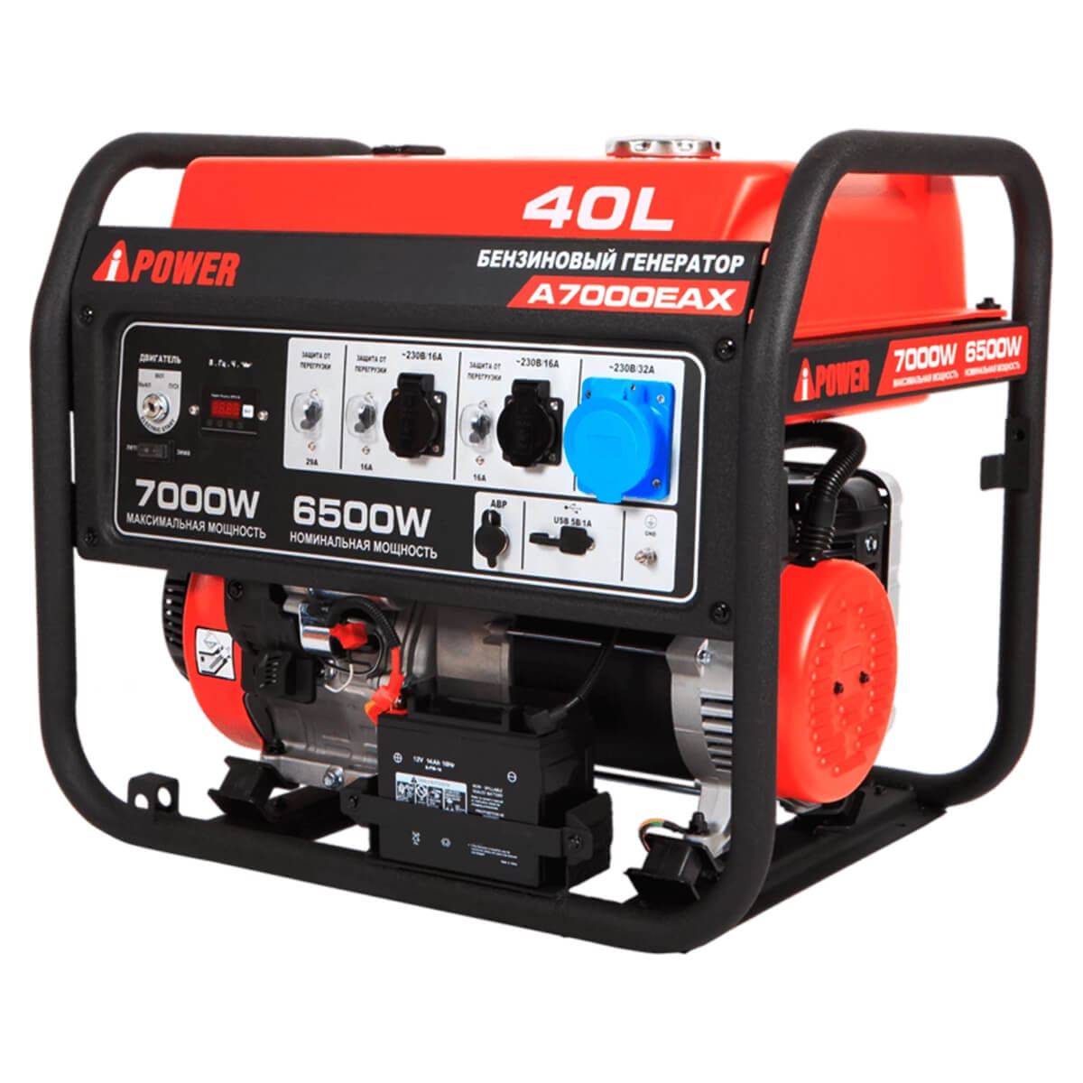 A-iPower A7000EAX оснащен компактным гильзованным 4-тактный OHV-двигателем объемом 420 куб. см с электро- стартером. На панели управления находится две стандартные розетки 230В/16А, одна силовая розетка 230В/32А, и разъем USB, от которого можно подзарядить смартфон, планшет и другие гаджеты. На цифровой дисплей в режиме реального времени выводятся сведения о работе генератора. Генератор имеет выход для подключения АВР, с возможностью организации источника резервного питания для загородного дома, магазина или кафе.