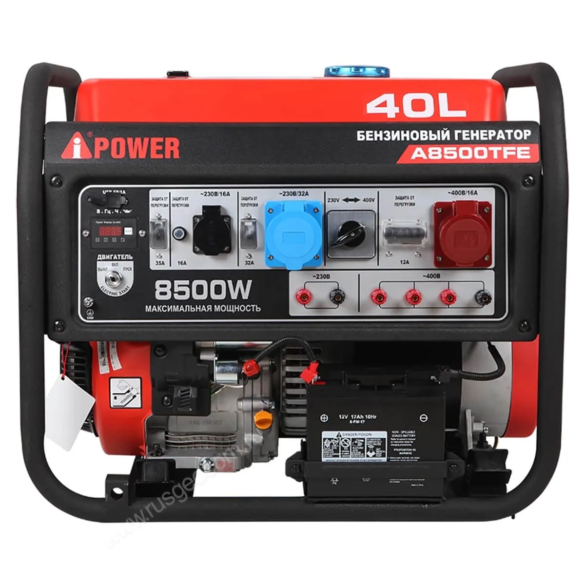 A-iPower A8500TFE + транспортировочный комплект A-iPower L оснащен мощным гильзованным 4-тактным OHV-двигателем объемом 459 куб. см с электрическим стартером. На панели управления находится одна стандартная розетка 230В/16А, одна силовая розетка 230В/32А, одна трехфазная розетка 400В/16А, клеммы для снятия полной мощности, и разъем USB, от которого можно подзарядить смартфон, планшет и другие гаджеты. На цифровой дисплей в режиме реального времени выводятся сведения о работе генератора. Электростартер обеспечивает быстрый и лёгкий запуск двигателя (аккумулятор входит в комплект поставки).