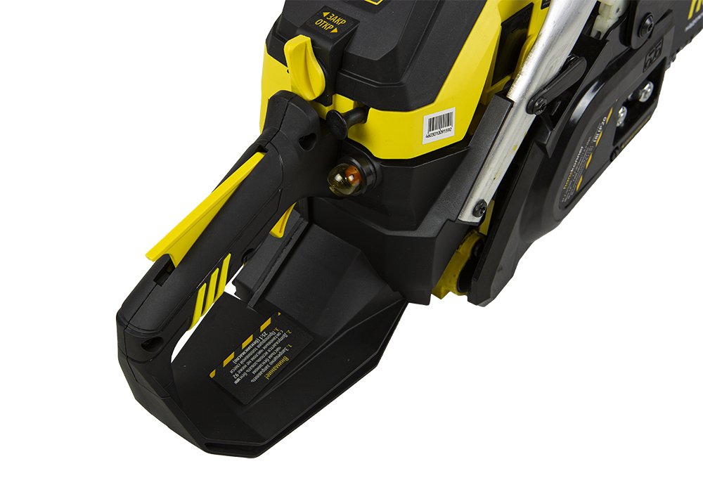 Безопасность работы обеспечивается предохранительной клавишей, предотвращающей случайное нажатие газа, ограничителем цепи, защитным щитком для правой руки, а также цепным тормозом, активируемым принудительно либо силой инерции. Два способа активации тормоза цепи повышают безопасность труда.