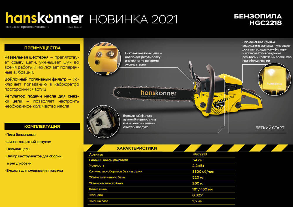 Бензопила Hanskonner HGC2218 - надежная универсальная бензиновая пила – предназначена для широкого спектра работ: от расчистки лесных насаждений до эксплуатации на приусадебных территориях.
