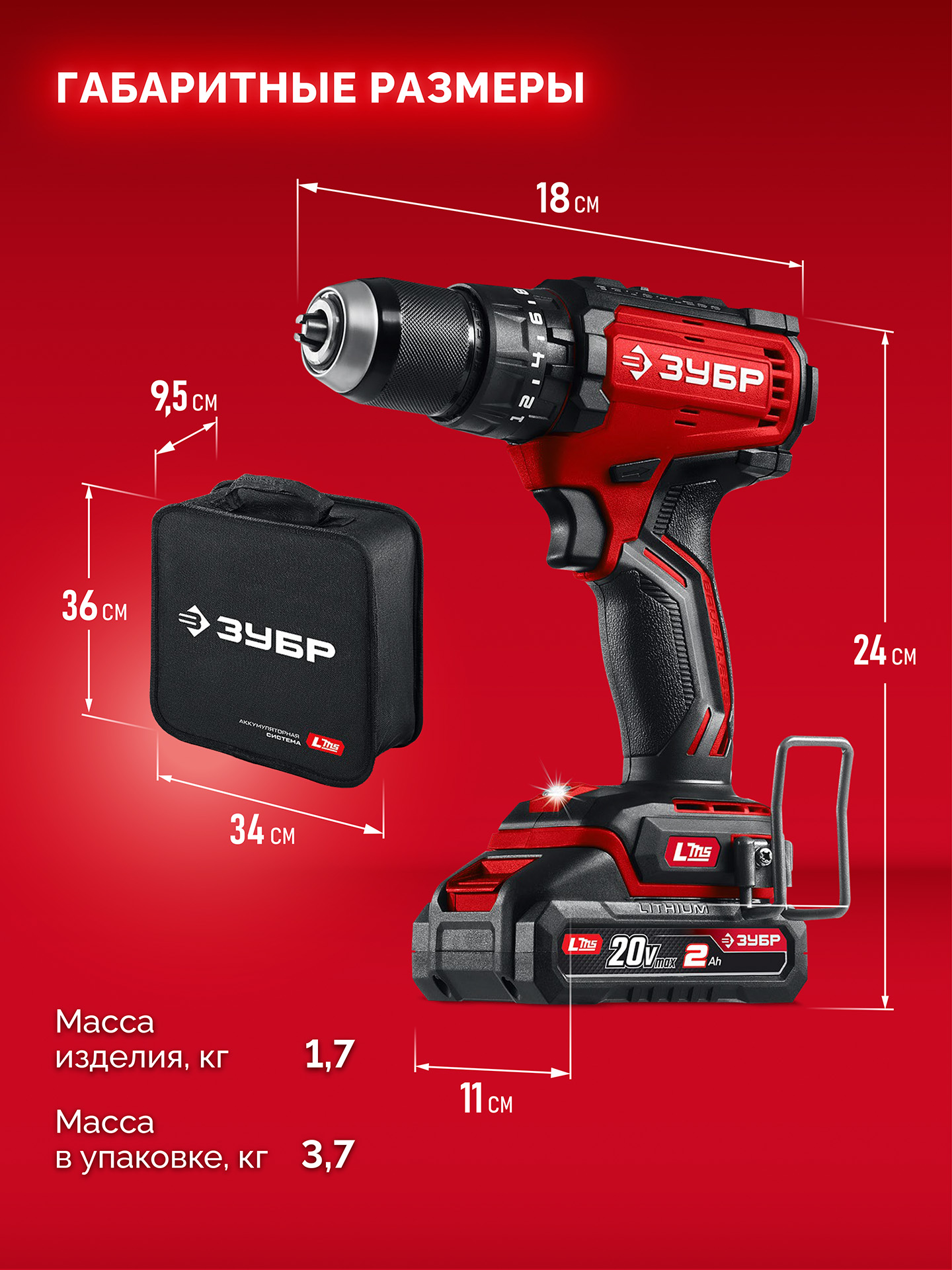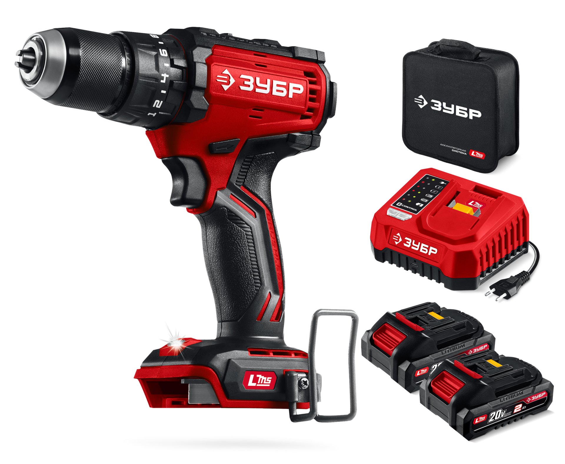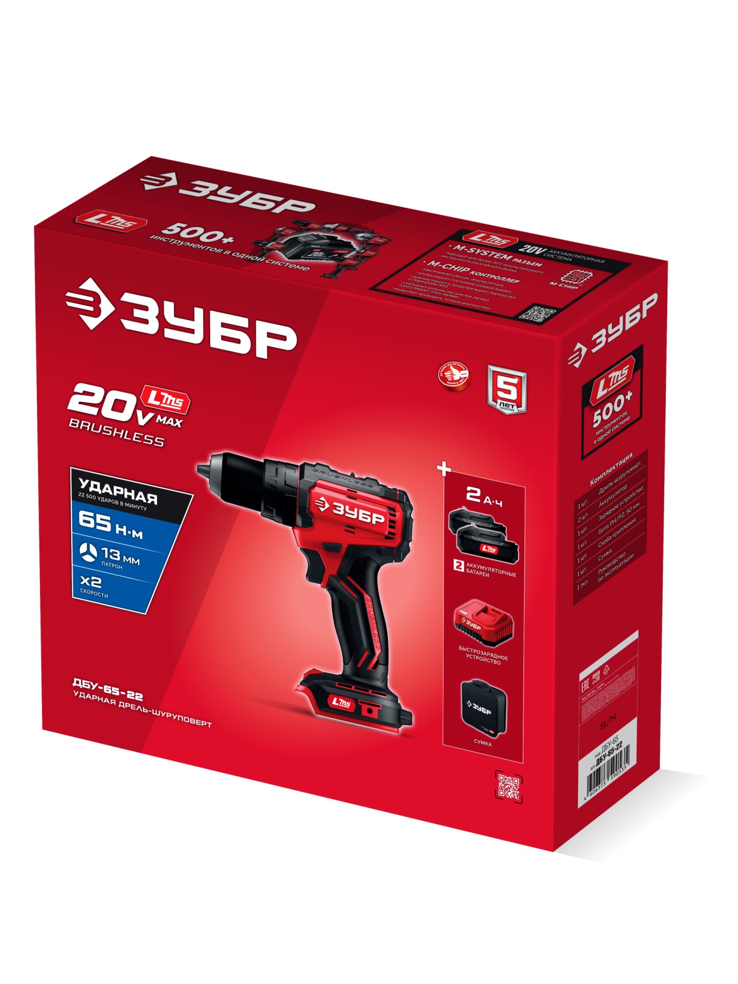 Бесщеточная ударная дрель-шуруповерт ЗУБР 20 В, 65 Н·м, 2 АКБ LMS (2 А·ч), сумка ДБУ-65-22 - предназначена для сверления отверстий в различных материалах (при установке соответствующих сверл), закручивания/откручивания резьбовых соединений (при установке соответствующих бит), перемешивания ЛКМ (при установке соответствующих насадок).
