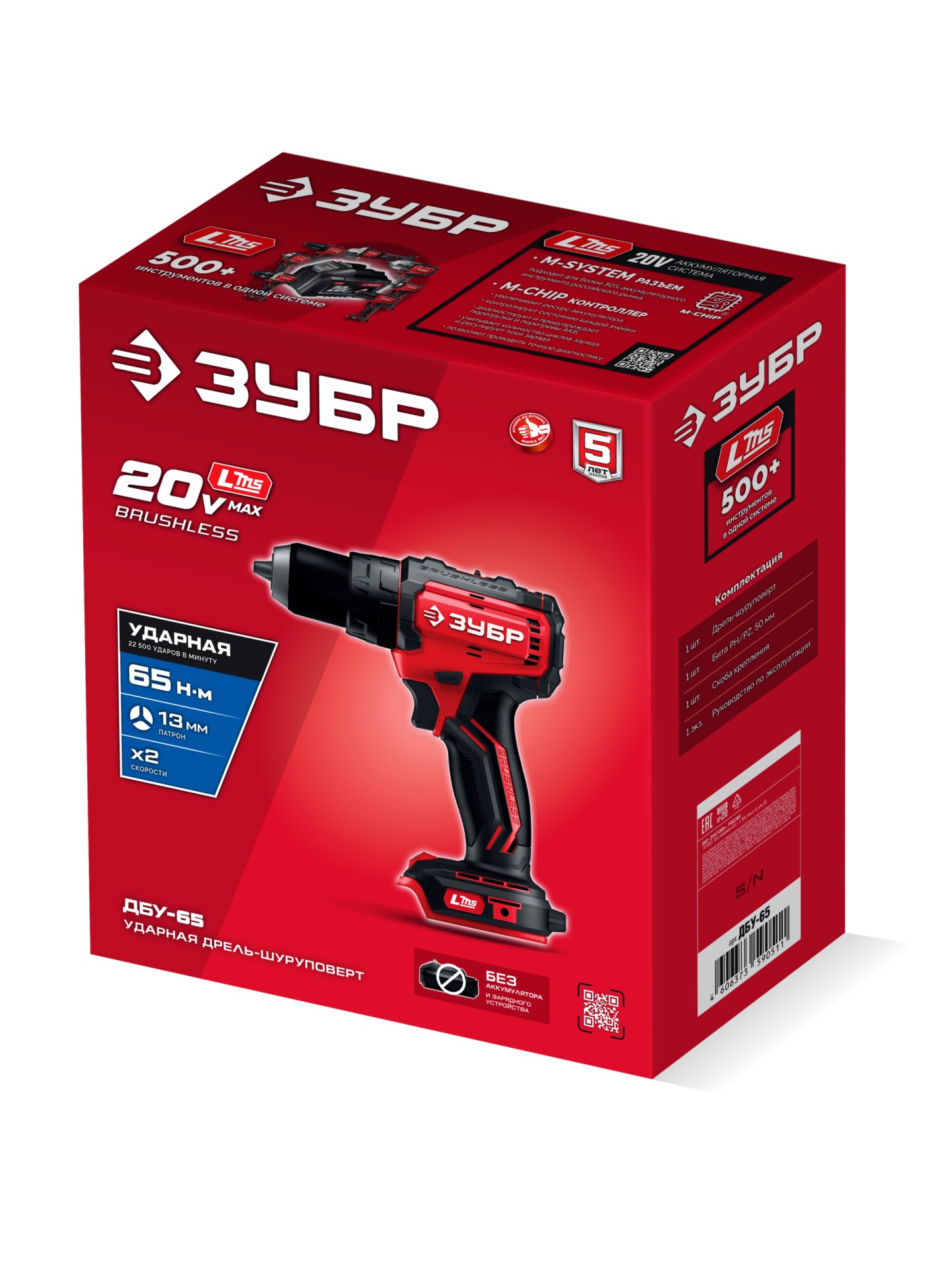 Бесщеточная ударная дрель-шуруповерт ЗУБР 20 В, 65 Н·м, без АКБ (LMS), ДБУ-65 - предназначена для сверления отверстий в различных материалах (при установке соответствующих сверл), закручивания/откручивания резьбовых соединений (при установке соответствующих бит), перемешивания ЛКМ (при установке соответствующих насадок).