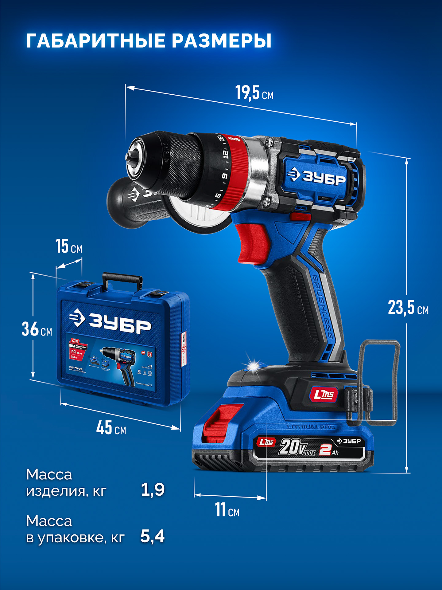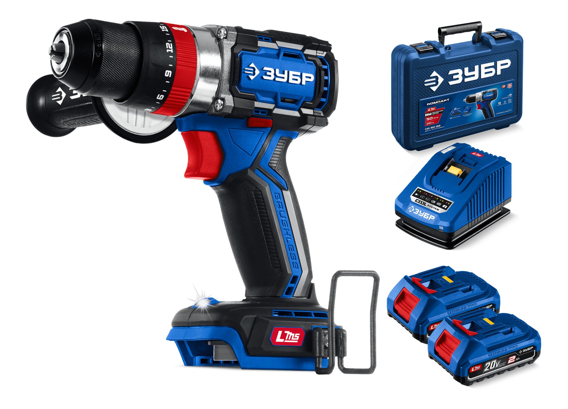 Бесщеточная ударная дрель-шуруповерт ЗУБР 20 В, 70 Н·м, 2 АКБ LMS (2 А·ч), кейс, ПРОФЕССИОНАЛ DBS-70-22 - предназначена для сверления отверстий в различных материалах (при установке соответствующих сверл), закручивания/откручивания резьбовых соединений (при установке соответствующих бит), перемешивания ЛКМ (при установке соответствующих насадок).