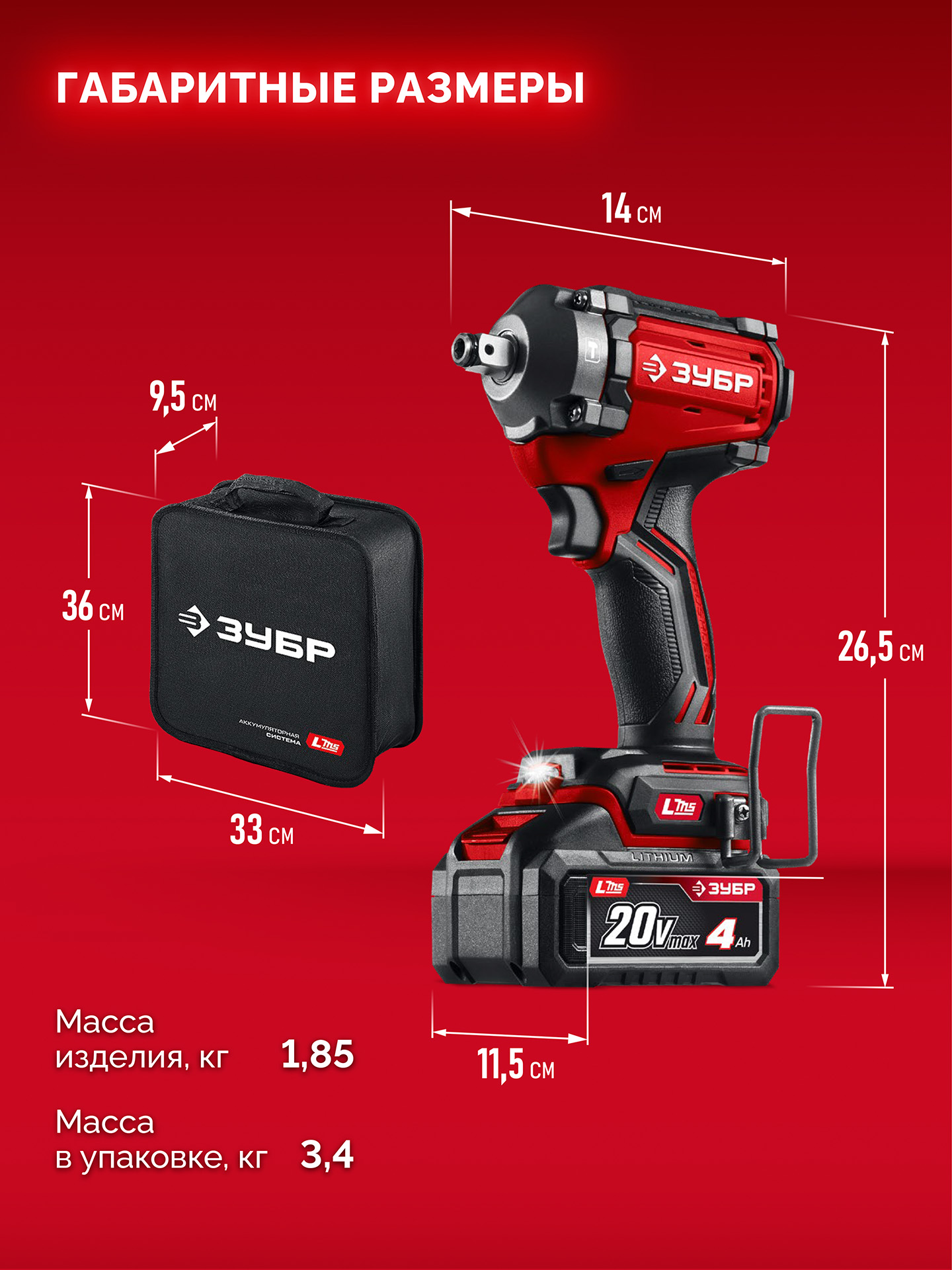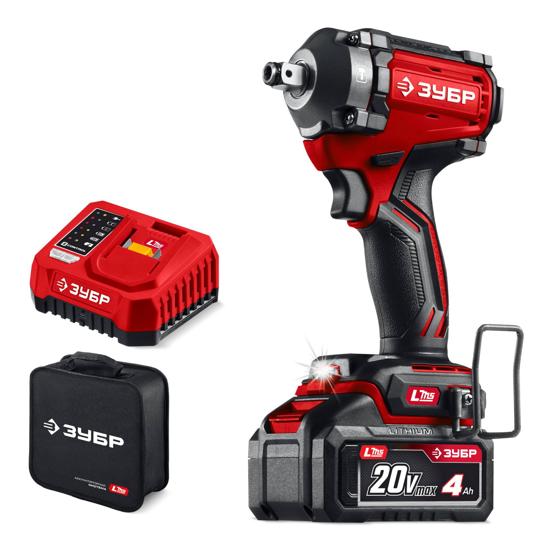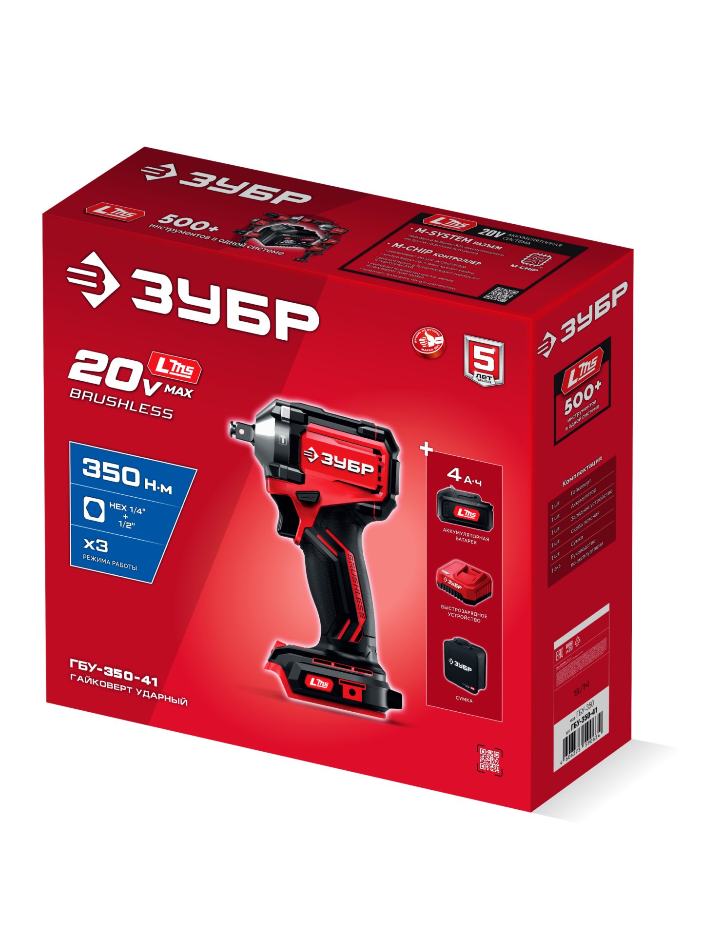 Бесщеточный ударный гайковерт ЗУБР ГБУ-350-41, 20 В, 350 Н·м, 1 АКБ LMS (4 А·ч), сумка - предназначен для закручивания / откручивания крепежных элементов при сборке/разборке металлических конструкций, снятии / установке колес автомобиля и т. д.