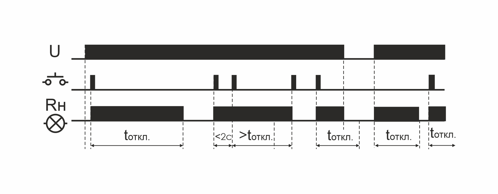 Принцип работы: Включение нагрузки осуществляется подачей электрического импульса на вход управления реле замыканием любого из выключателей кнопочного типа, параллельно соединенных между собой. Выключение нагрузки произойдёт после очередного замыкания одного из выключателей, либо по окончании времени выключения, установленного переключателем на корпусе реле в интервале от 1 до 12 минут.