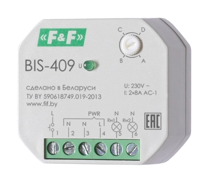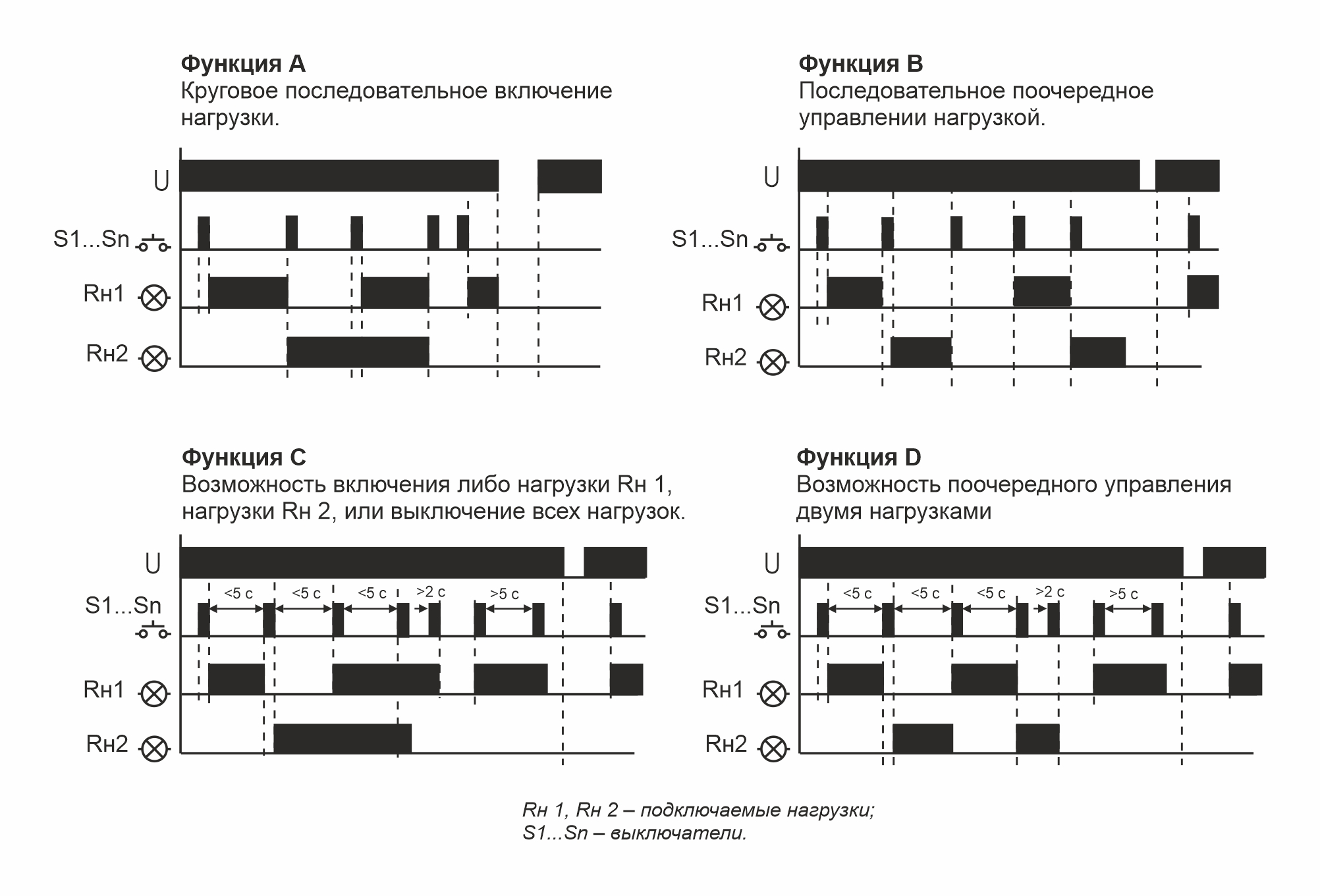Особенности: 4 функции работы; два исполнительных реле; последовательное управление нагрузкой; нет памяти контактов; возможно подключение выключателей кнопочного типа с подсветкой; максимальный ток нагрузки 2х8 А.