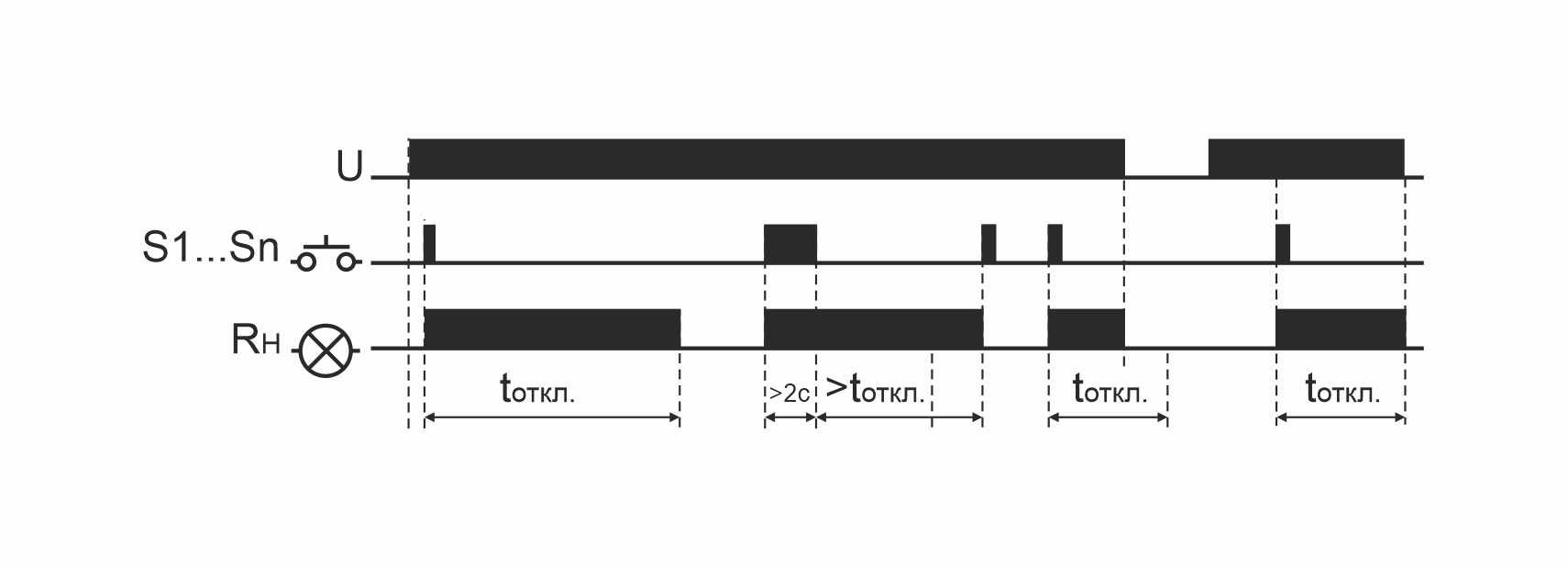 Принцип работы: включение нагрузки осуществляется подачей электрического импульса на вход управления реле замыканием любого из выключателей кнопочного типа, параллельно соединенных между собой. Выключение нагрузки произойдёт после очередного замыкания одного из выключателей, либо по окончании времени выключения, установленного переключателем на корпусе реле в интервале от 1 до 15 минут.