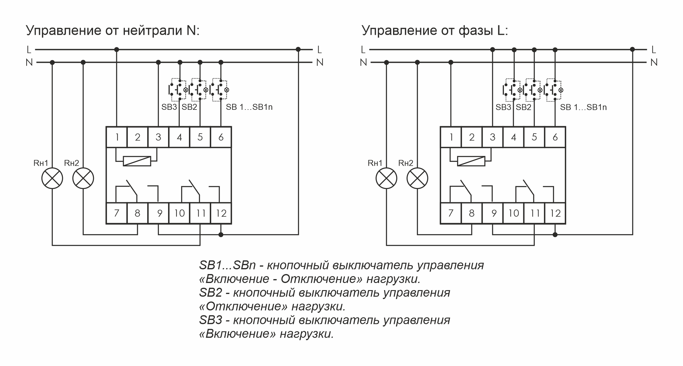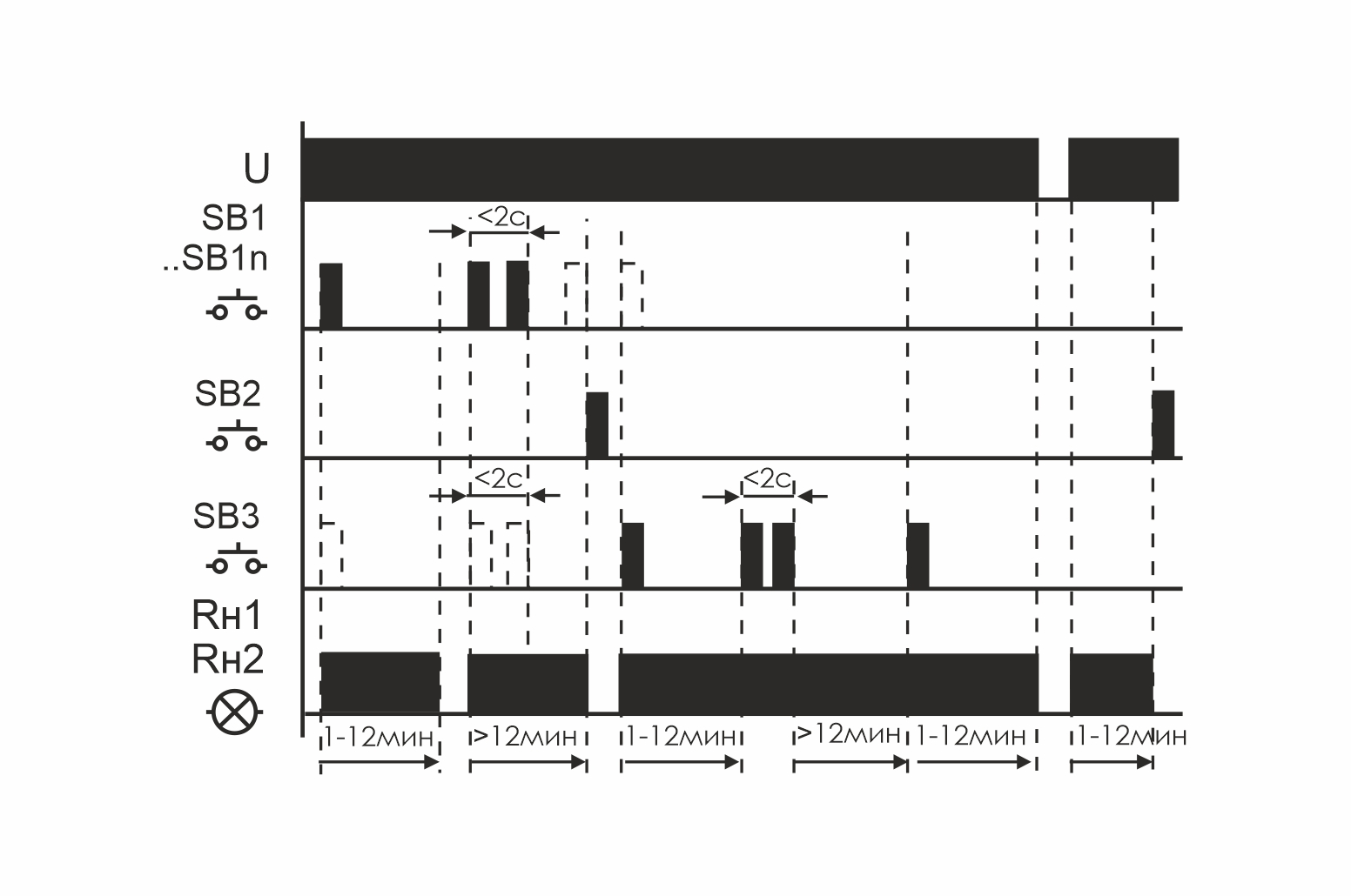 Принцип работы: включение нагрузки осуществляется подачей электрического импульса на вход управления реле замыканием любого из выключателей кнопочного типа, параллельно соединенных между собой. Выключение нагрузки произойдёт после очередного замыкания одного из выключателей, либо по окончании времени выключения, установленного переключателем на корпусе реле в интервале от 1 до 12 минут.