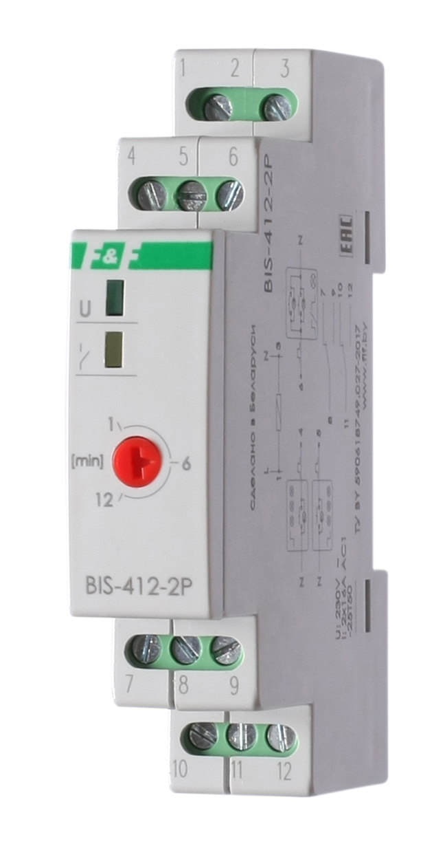 Монтаж на DIN-рейку. Предназначено для управления двумя нагрузками: включения/выключения освещения, электроустановок и т.п. из нескольких мест выключателями кнопочного типа, параллельно соединенными между собой. У реле три независимых входа управления, что позволяет использовать для группового режима работы. Таймер времени реле обеспечивает выключение нагрузок через настраиваемый интервал времени в диапазоне от 1 до 12 минут.