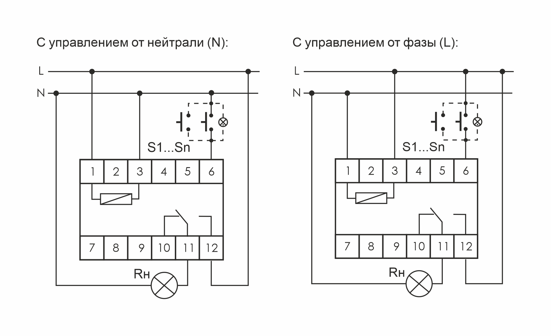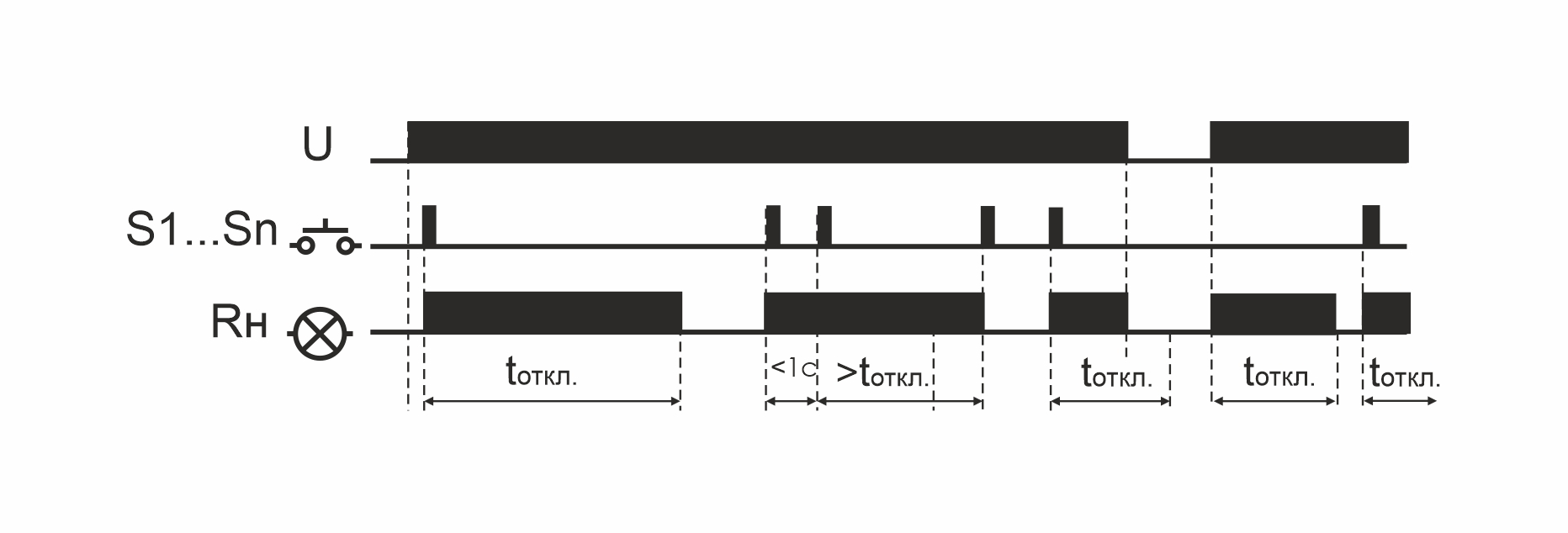Принцип работы: включение нагрузки осуществляется подачей электрического импульса на вход управления реле замыканием любого из выключателей кнопочного типа, параллельно соединенных между собой. Выключение нагрузки произойдёт после очередного замыкания одного из выключателей, либо по окончании времени выключения, установленного переключателем на корпусе реле в интервале от 1 до 12 минут.