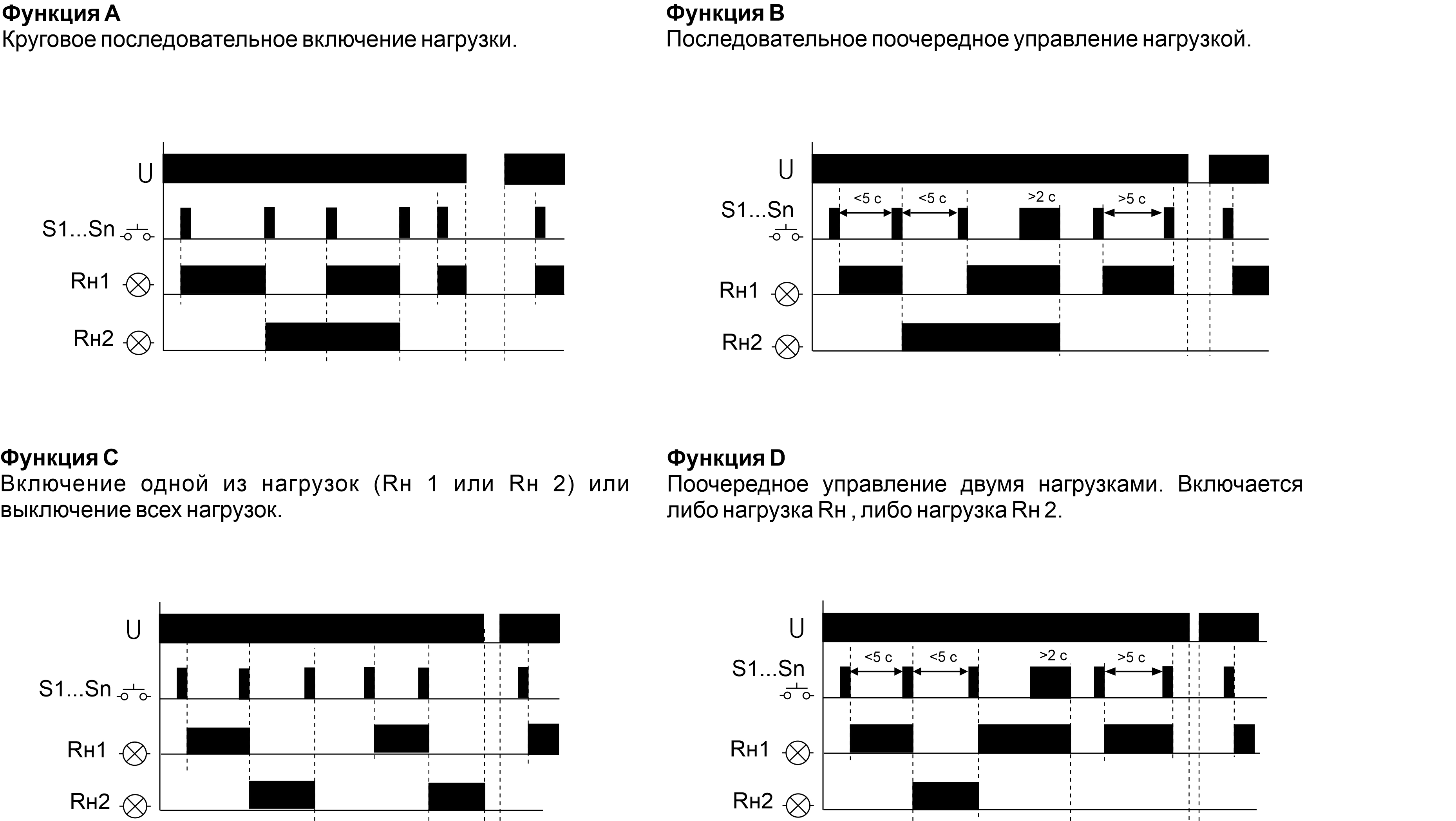 Особенности: 4 функции работы; два исполнительных реле; последовательное управление нагрузкой; нет памяти контактов;
