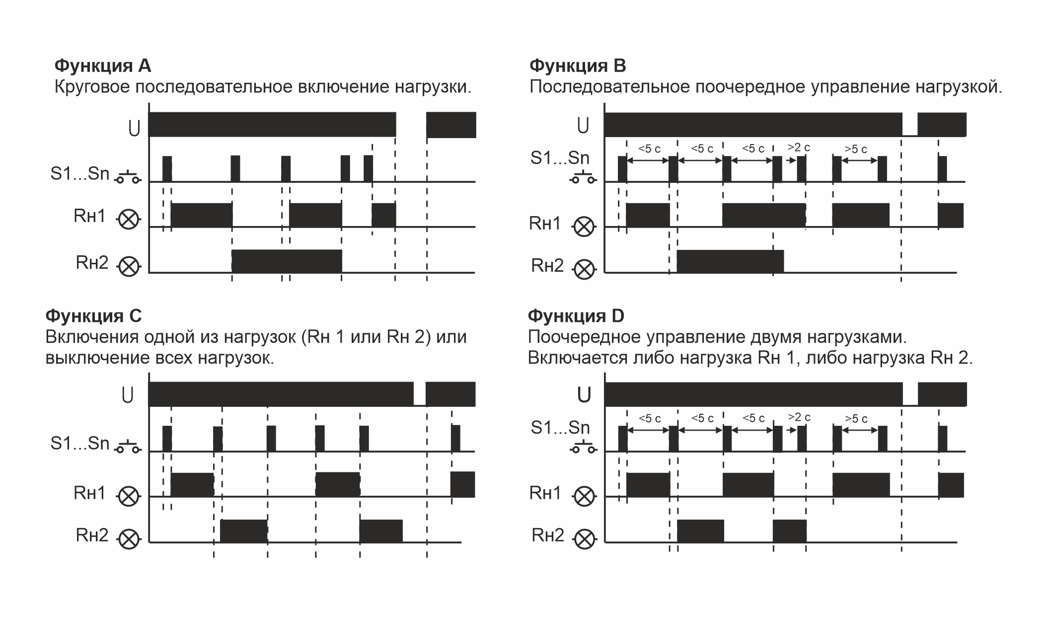 Особенности: 4 функции работы; два исполнительных реле; последовательное управление нагрузкой; нет памяти контактов; возможно подключение выключателей кнопочного типа с подсветкой; для LED освещения, кратковременная коммутация нагрузки с большим пусковым током (120А/20мс); максимальный ток нагрузки 2х16 А.