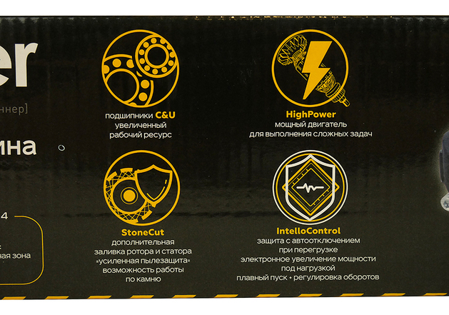 - В целях надежного и длительного использования ротор и статор, данной модели, дополнительно залиты лаком, что существенно повышает пылезащиту. Инструмент оборудован электродвигателем номинальной мощностью 2000 Вт для выполнения сложных задач, в том числе резки камня. Механизмы машины обеспечены фирменными подшипниками увеличенного ресурса.