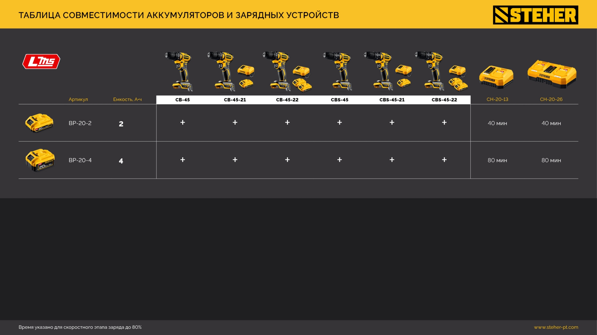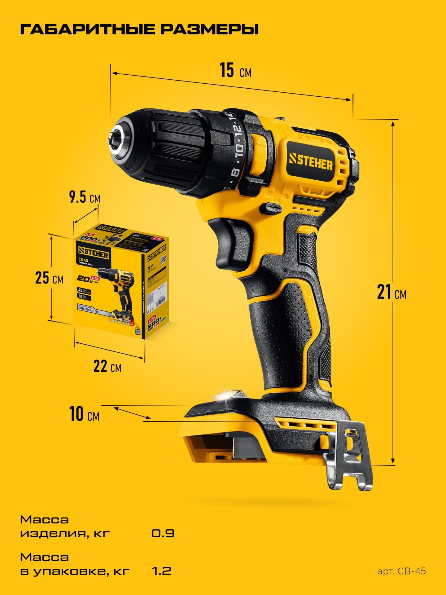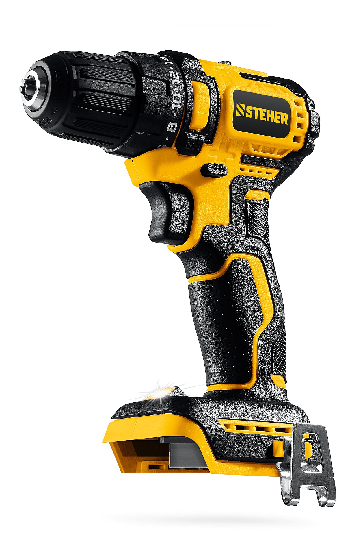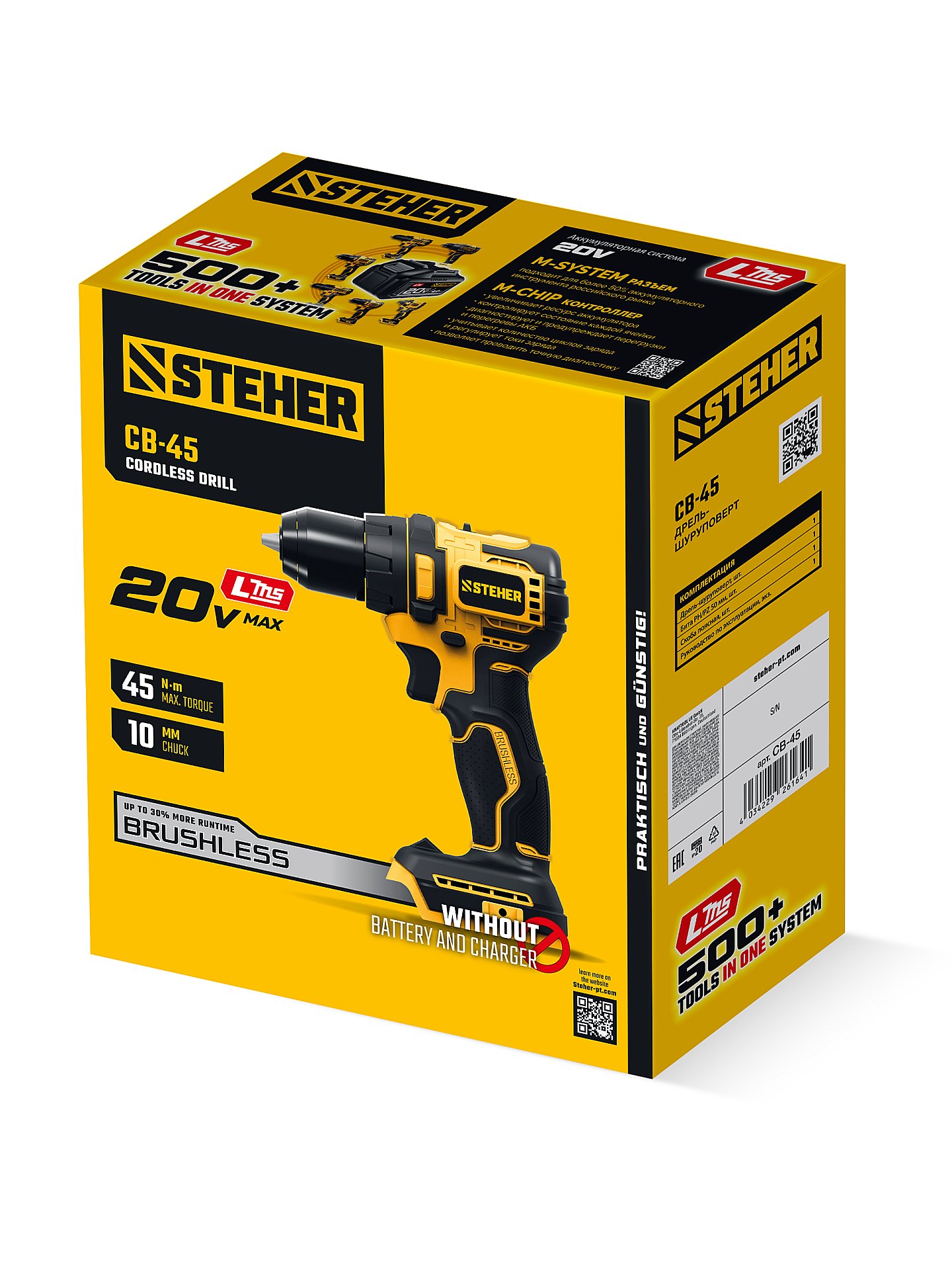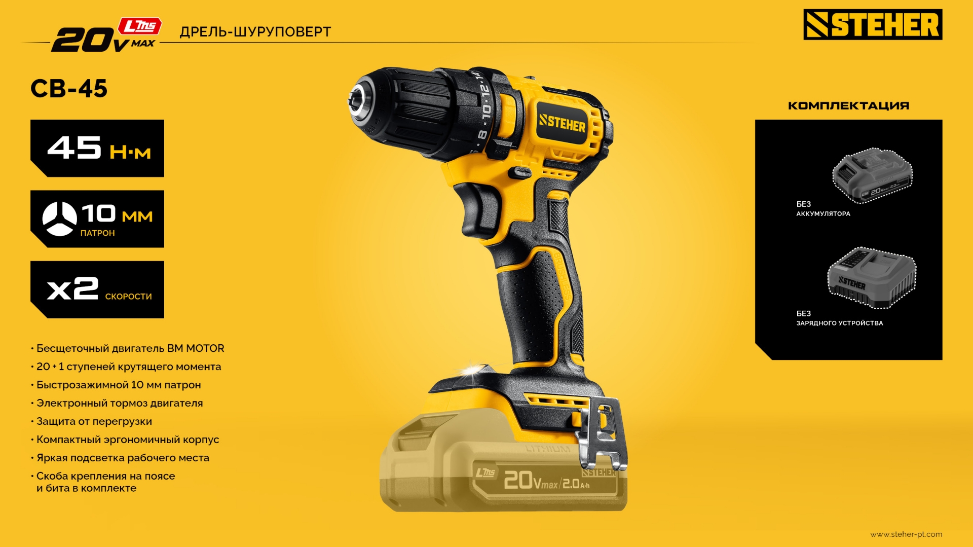 Бесщеточная дрель-шуруповерт STEHER 20 В, 45 Н·м, без АКБ (LMS) CB-45 - предназначена для сверления отверстий в различных материалах (при установке сверла), а также для вкручивания/выкручивания шурупов, саморезов и винтов (при установке соответствующих бит).
