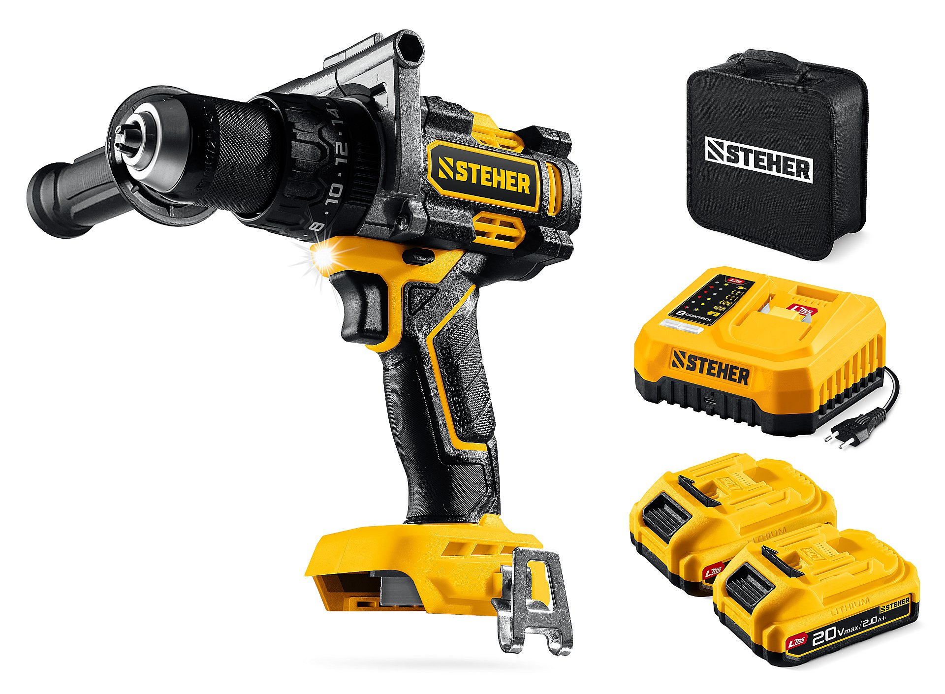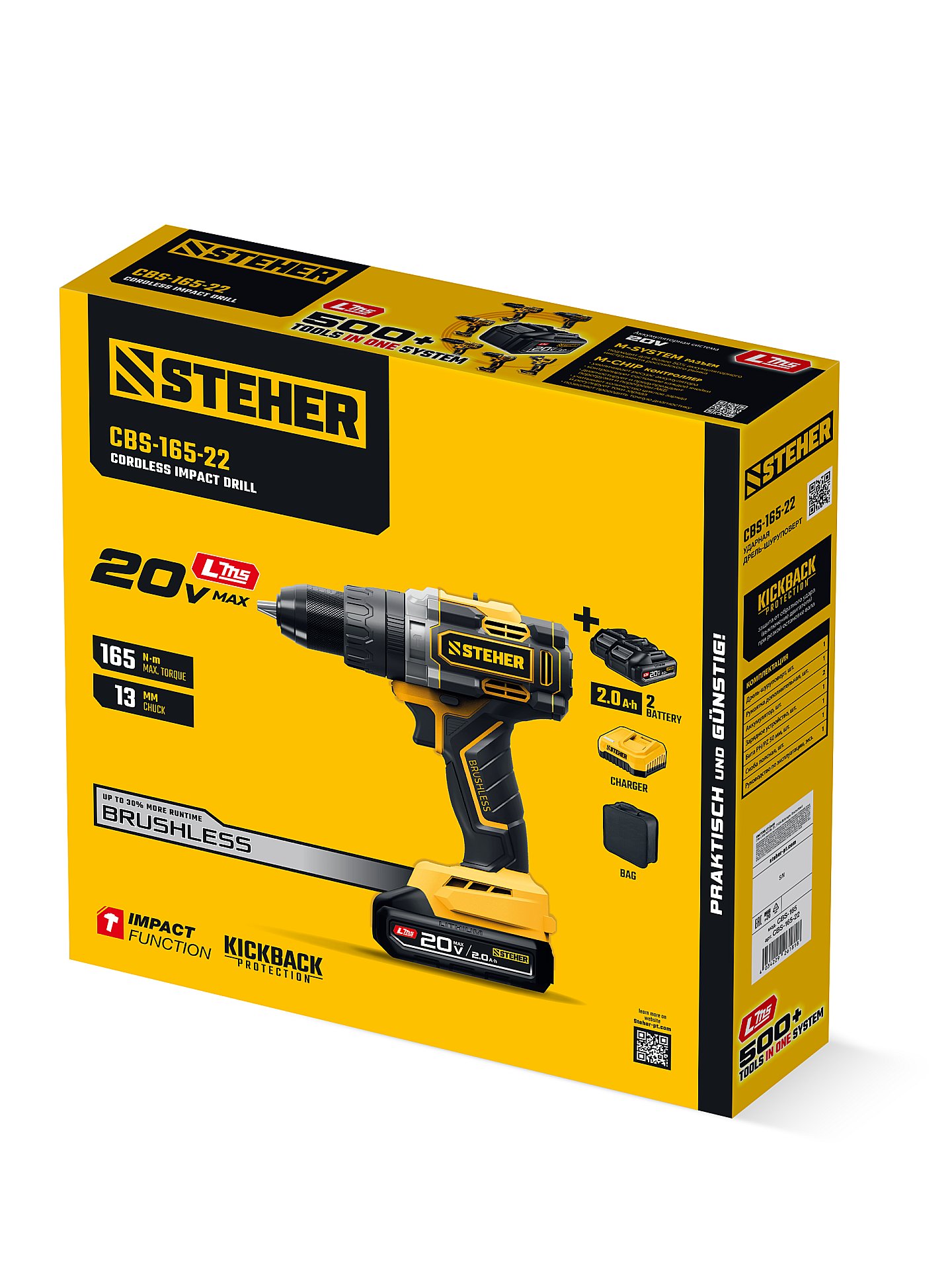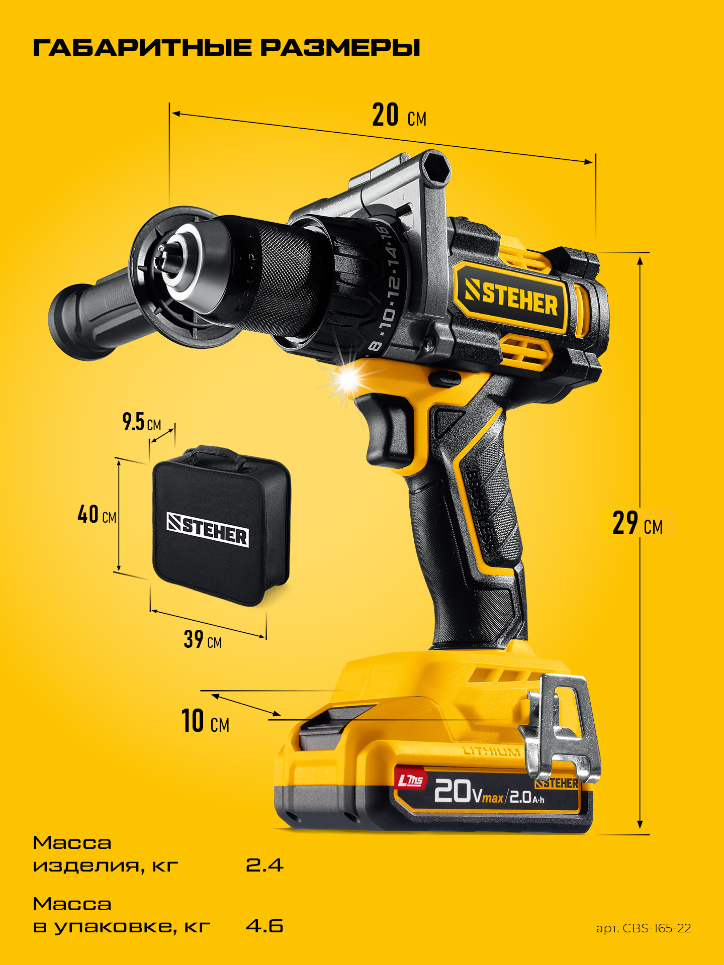 Бесщеточная ударная дрель-шуруповерт STEHER 20 В, 165 Н·м, 2 АКБ LMS (2 А·ч), сумка CBS-165-22 - бесщеточная ударная дрель-шуруповерт STEHER системы LMS с увеличенным крутящим моментом предназначена для быстрого заворачивания саморезов до 12 мм диаметром и сверления отверстий до 40 мм в дереве.