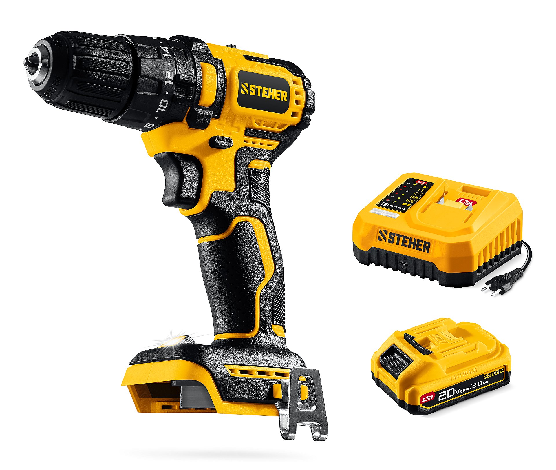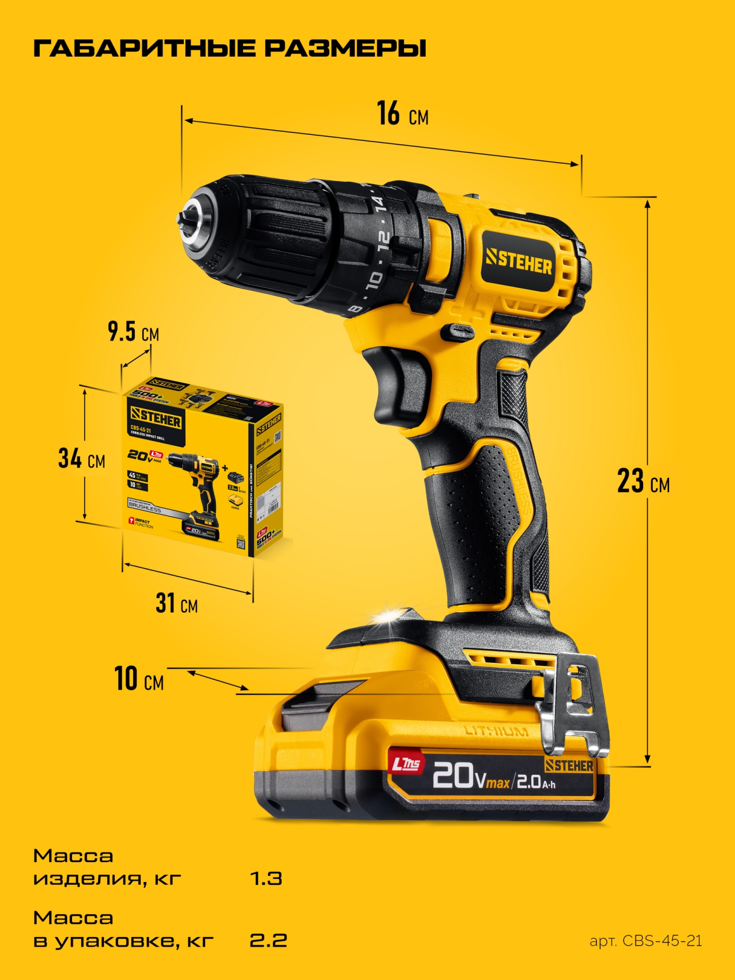 Бесщеточная ударная дрель-шуруповерт STEHER 20 В, 45 Н·м, 1 АКБ LMS (2 А·ч) CBS-45-21 - предназначена для сверления отверстий в различных материалах (при установке сверла), а также для вкручивания/выкручивания шурупов, саморезов и винтов (при установке соответствующих бит).