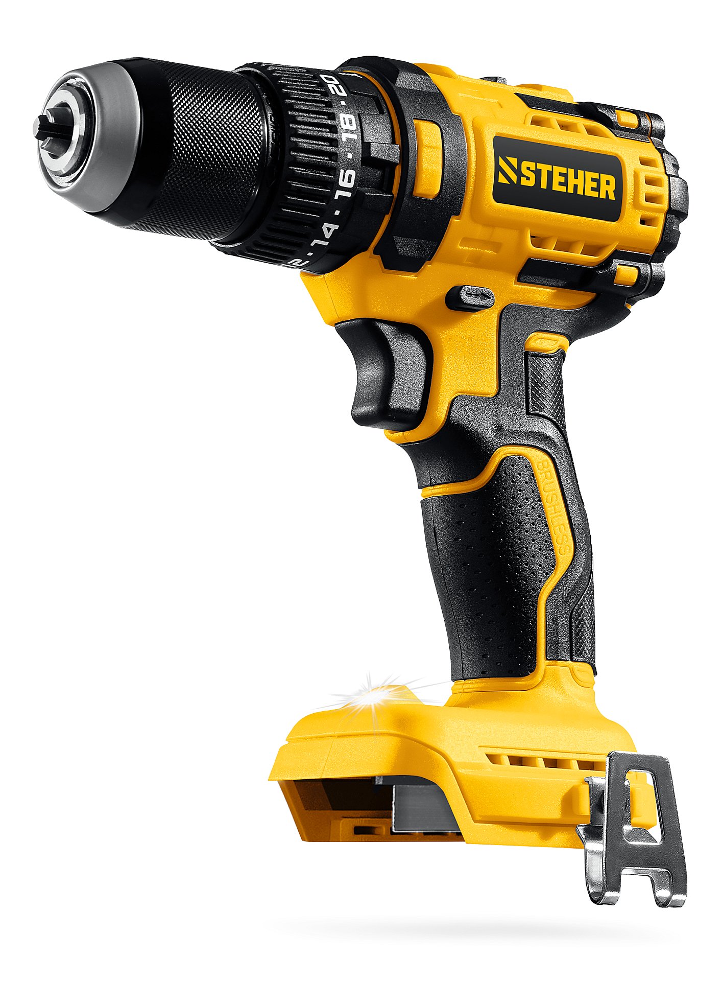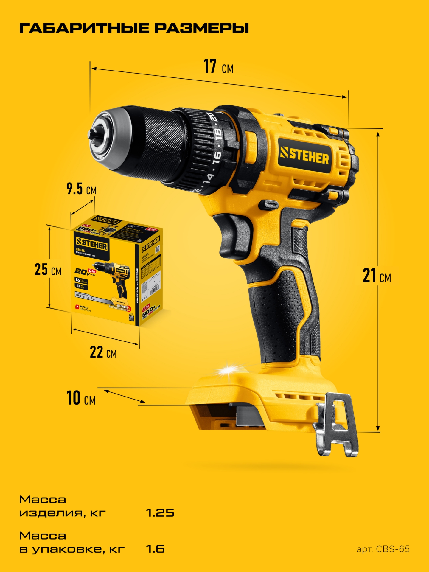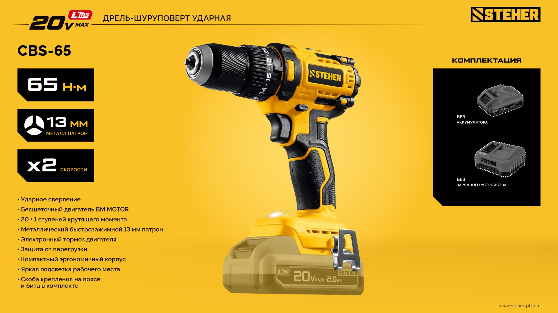 Бесщеточная ударная дрель-шуруповерт STEHER 20 В, 65 Н·м, без АКБ (LMS) CBS-65 - дрель-шуруповерт STEHER системы LMS с увеличенным крутящим моментом предназначена для быстрого заворачивания саморезов до 8 мм диаметром и сверления отверстий до 30 мм в дереве.