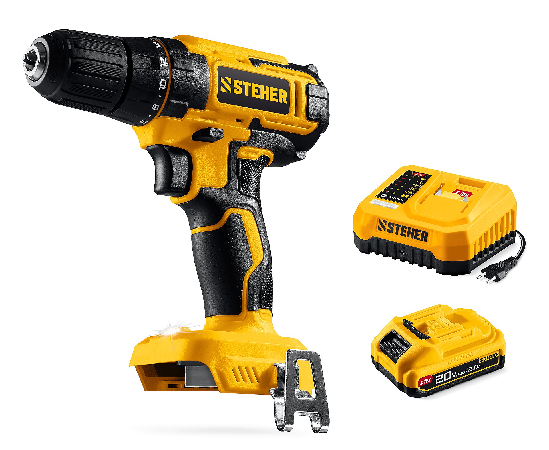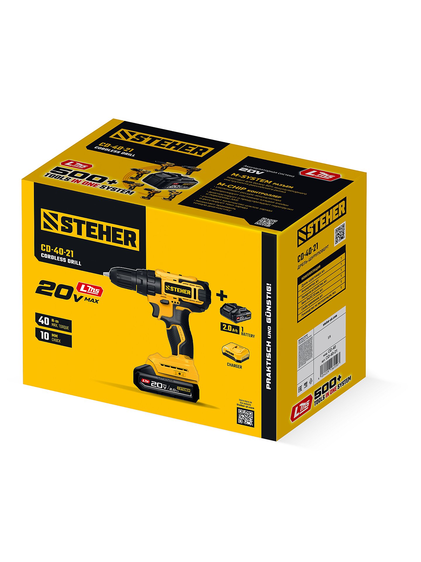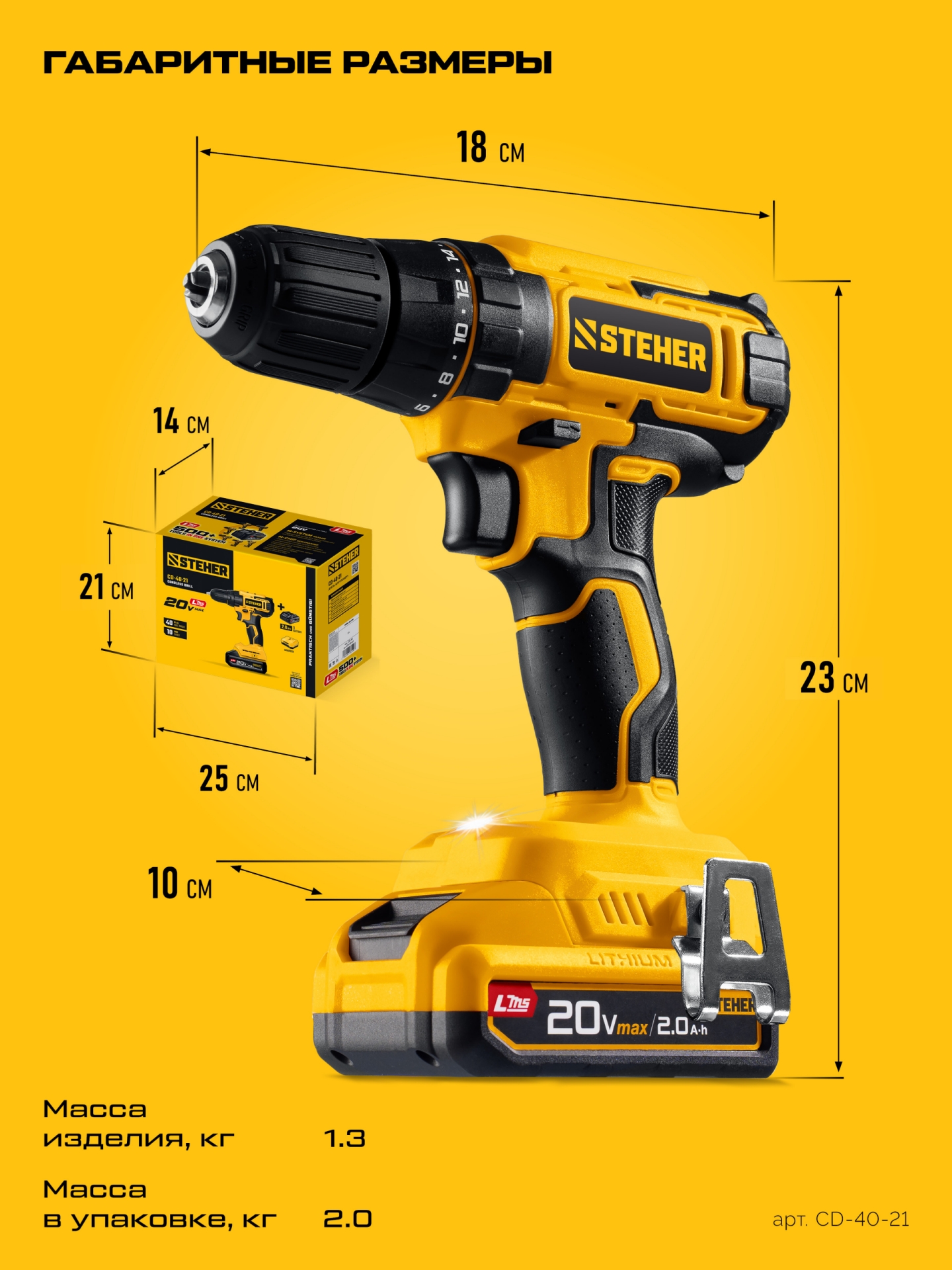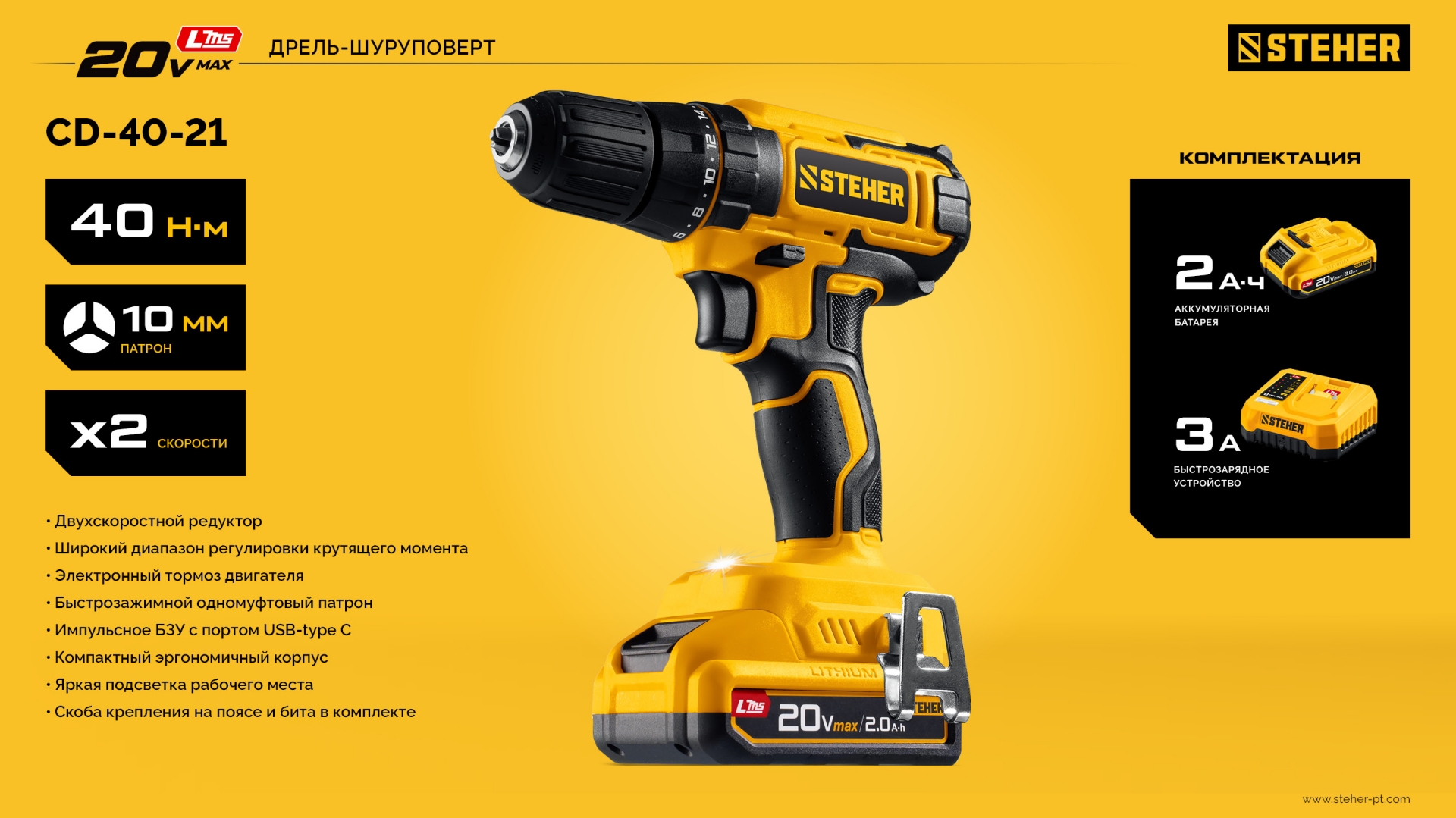 Дрель-шуруповерт STEHER 20 В, 40 Н·м, 1 АКБ LMS (2 А·ч) CD-40-21 - предназначена для сверления отверстий в различных материалах (при установке сверла), а также для вкручивания/выкручивания шурупов, саморезов и винтов (при установке соответствующих бит).