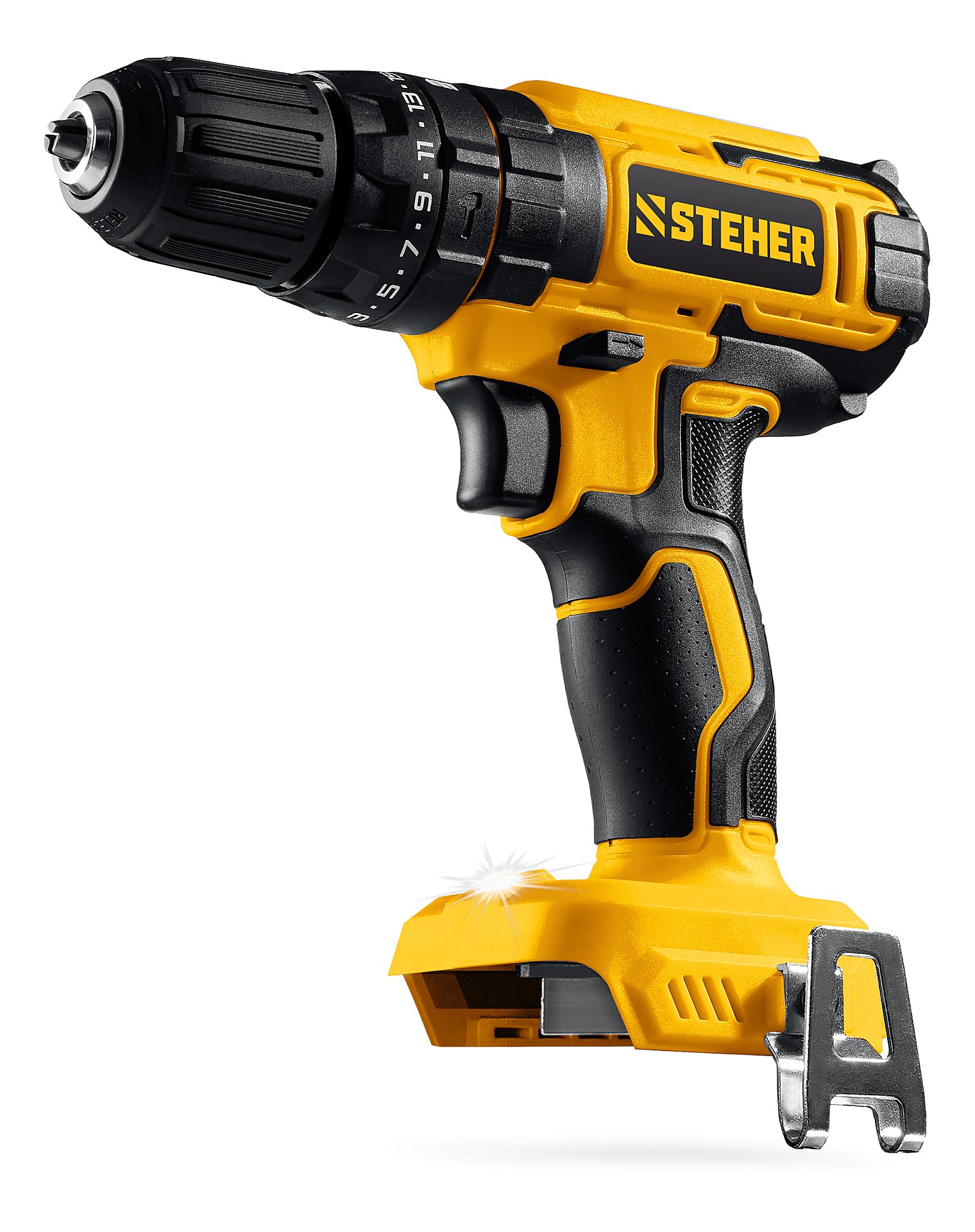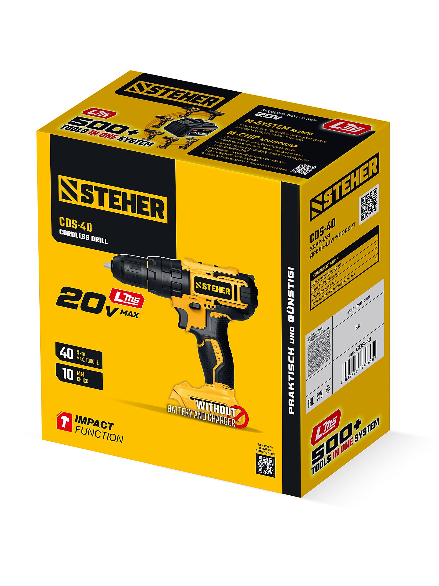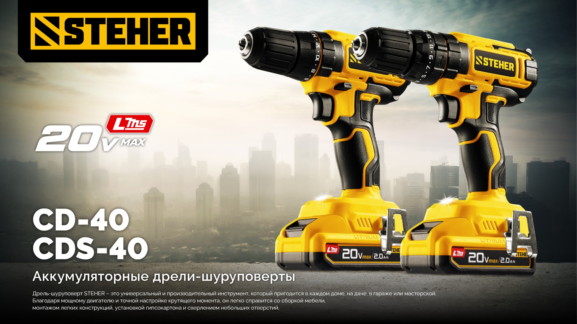 Ударная дрель-шуруповерт STEHER 20 В, 40 Н·м, без АКБ (LMS) CDS-40 - предназначена для сверления отверстий в различных материалах (при установке сверла), а также для вкручивания/выкручивания шурупов, саморезов и винтов (при установке соответствующих бит).
