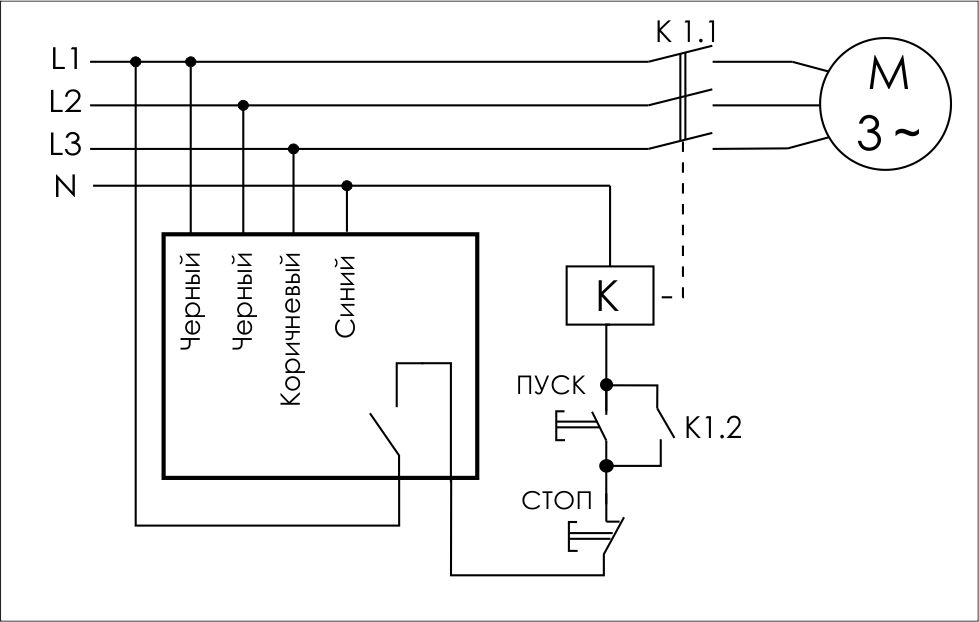 Принцип работы: Если напряжение в пределах нормы, контакты исполнительного реле замкнуты и на контактор управления электродвигателем подается напряжение, управляющее его включением. В случае одной из вышеперечисленных аварийных ситуаций контакты реле размыкаются и контактор отключается. Включение происходит автоматически после восстановления сетевого напряжения питания.