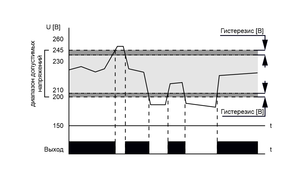 Особенности: напряжение питания - 150...310VAC; максимальный ток нагрузки - 16 А; контакты - 1NO; нижний порог напряжений - 150...210; верхний порог напряжений - 230...310.