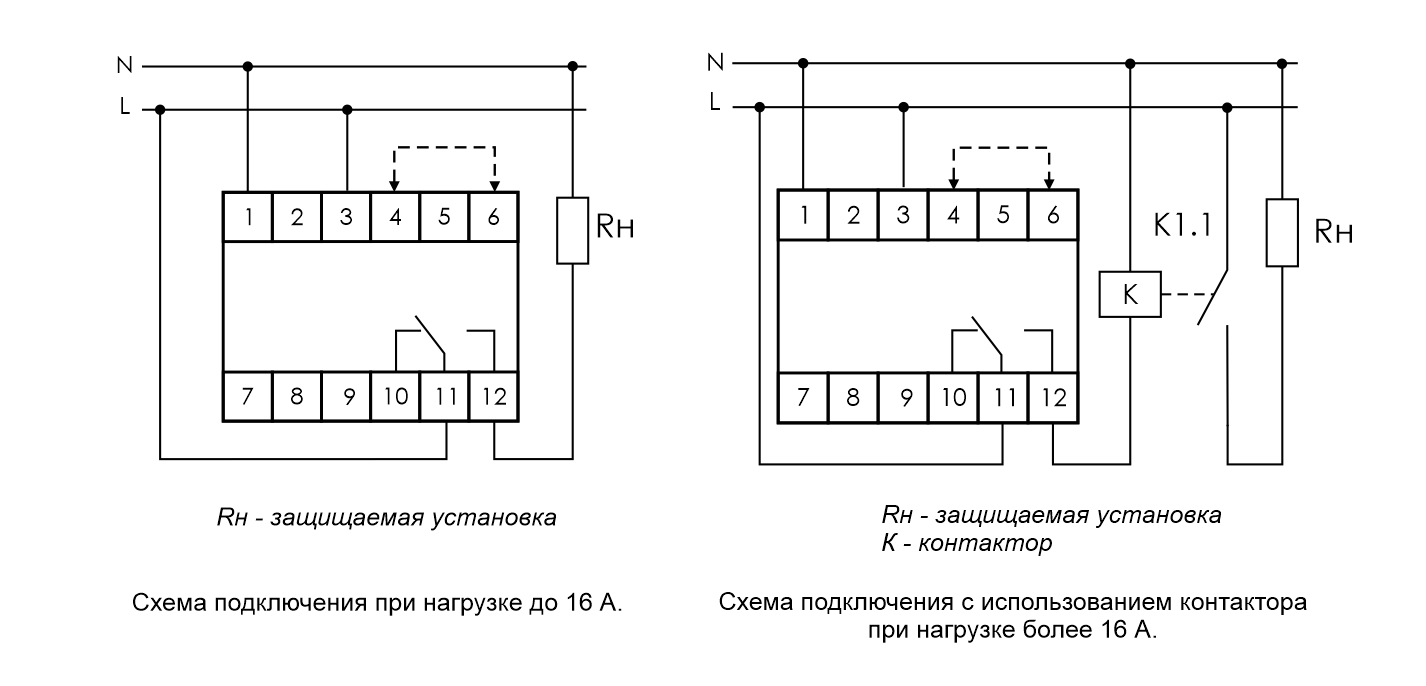 Монтаж на DIN-рейку. Предназначено для защиты электроустановок, электроприборов и прочего электронного оборудования от повышенного или пониженного напряжения, от обрыва нулевого провода. Защита осуществляется путем отключения нагрузки от сети питания. Верхний и нижний пределы напряжения устанавливает потребитель с помощью потенциометров на панели управления. При выходе напряжения за установленные пределы или обрыве нулевого провода реле отключает защищаемое оборудование. После восстановления сетевого напряжения реле включается автоматически через время повторного включения (если перемычка на зажимах 4-6 установлена, время повторного включения составит 6 минут, если отсутствует - 4 секунды). Если контролируемое напряжение находится в пределах заданного потенциометрами диапазона, контакты 11 и 12 исполнительного реле замкнуты - горит зеленый светодиод.