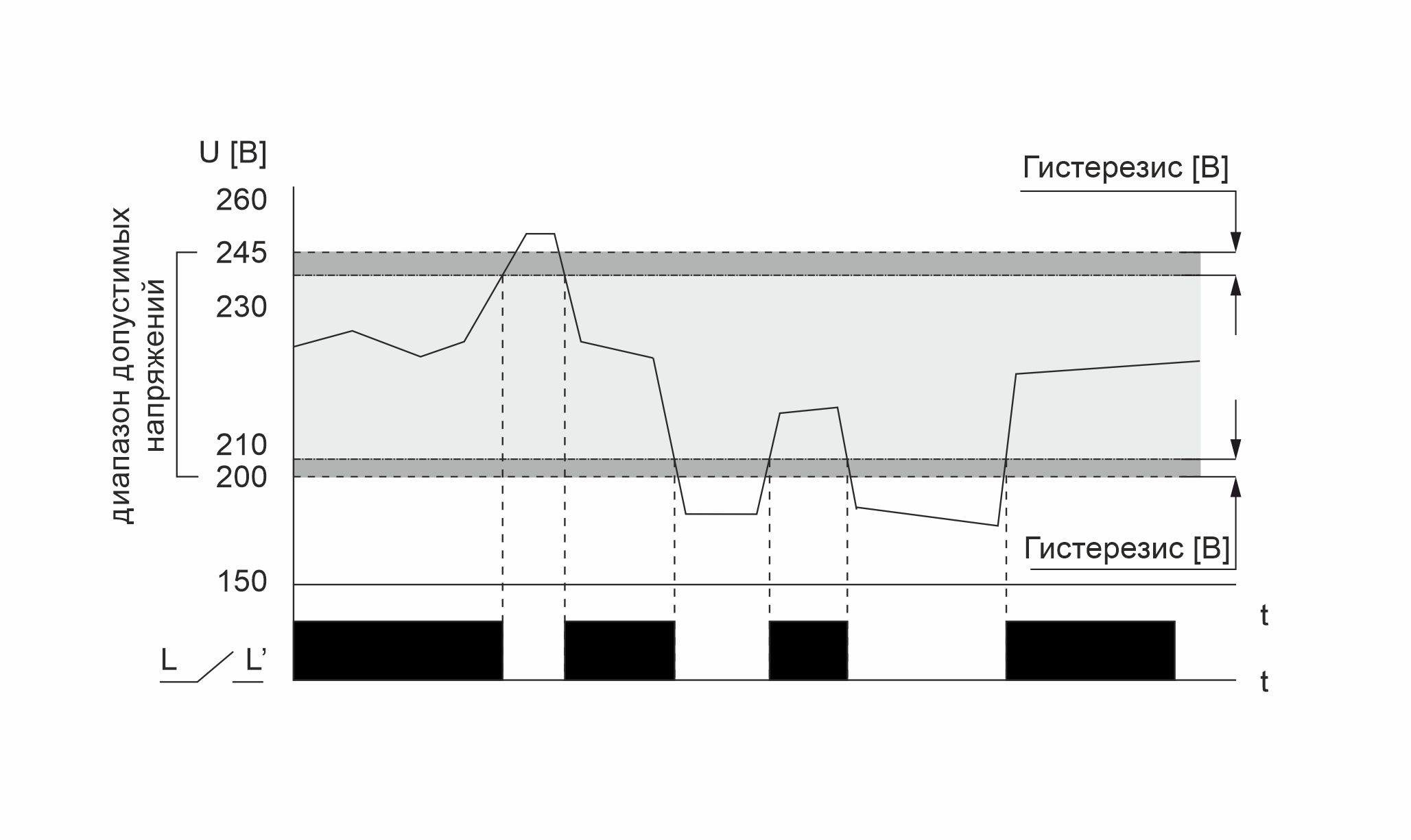 Монтаж на DIN-рейку. Предназначено для защиты электроустановок, электроприборов и прочего электронного оборудования от повышенного или пониженного напряжения, асимметрии, нарушения чередования фаз. Защита осуществляется путем отключения нагрузки от сети питания. Регистрирует предельные значения напряжения, а также тип произошедшей аварии, контролирует величину напряжения в питающей трехфазной сети переменного тока. Реле контроля напряжения может работать в двух режимах: - ТРЕХФАЗНОЕ РЕЛЕ НАПРЯЖЕНИЯ - в данном режиме производится контроль минимального/максимального напряжения, асимметрии фаз, контроль чередования / «слипания» фаз. При выходе за пределы уставки выходные реле отключают потребителя от питающих фаз (всех трех). - ОДНОФАЗНОЕ РЕЛЕ НАПРЯЖЕНИЯ - производится контроль минимального/максимального напряжения отдельно в каждой из фаз, при выходе его за пределы, отключается реле той фазы, в которой произошла авария. Каждая фаза может иметь индивидуальные настройки напряжения и времени. Особенности: нап