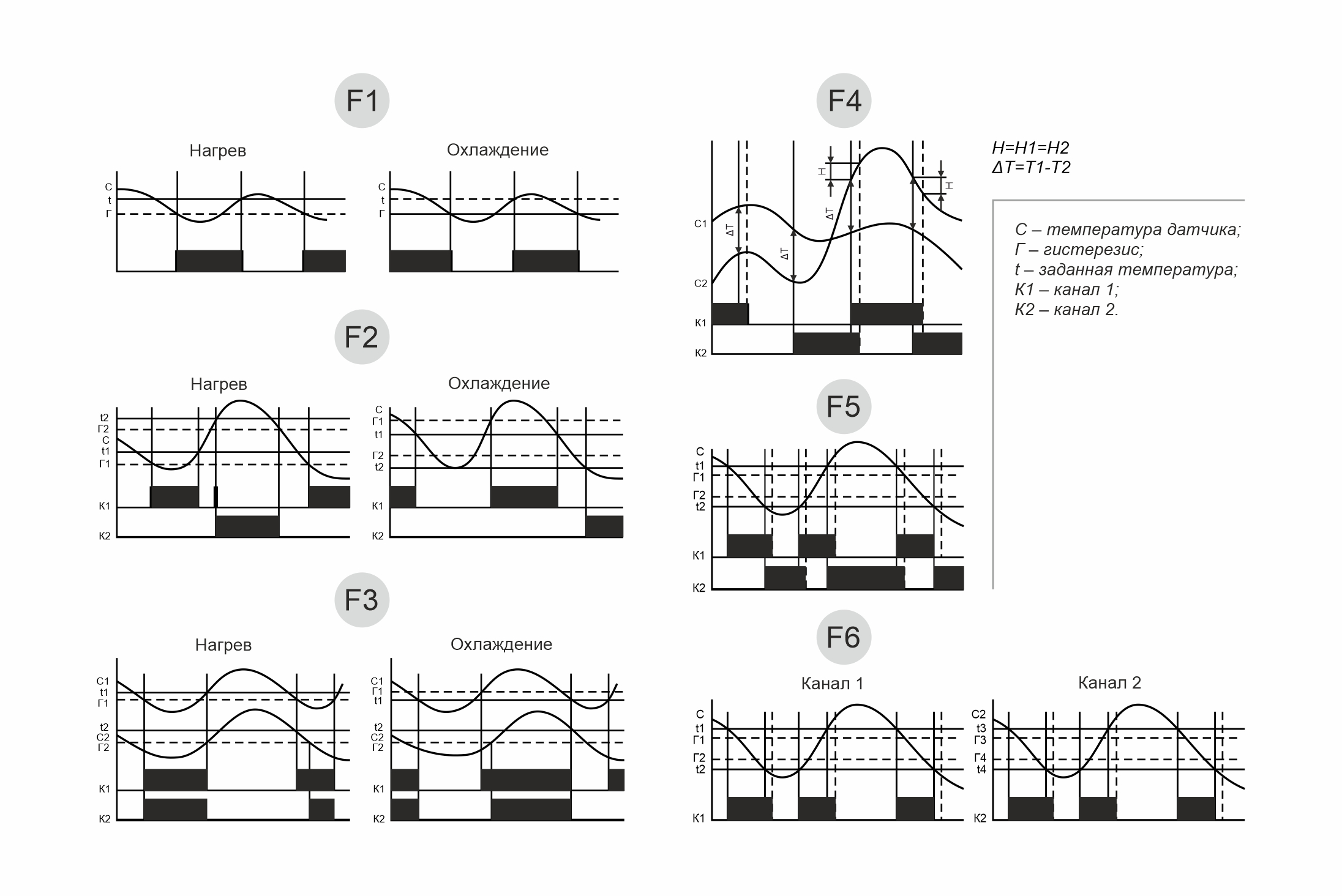 Особенности: двухканальный; многофункциональный; цифровая индикация; 6 режимов работы; установка двух независимых значений температуры; для каждого значения температуры можно установить отдельно величину гистерезиса; температурная коррекция погрешности измерения датчиков температуры; сигнализация аварийного режима работы на индикаторе; датчики RT823 в комплекте; напряжение питания 100...264 В AC/DC; диапазон регулируемых температур -50...+140°С; гистерезис 0,5...25°С; контакт - 2NO/NC (2х16 А).