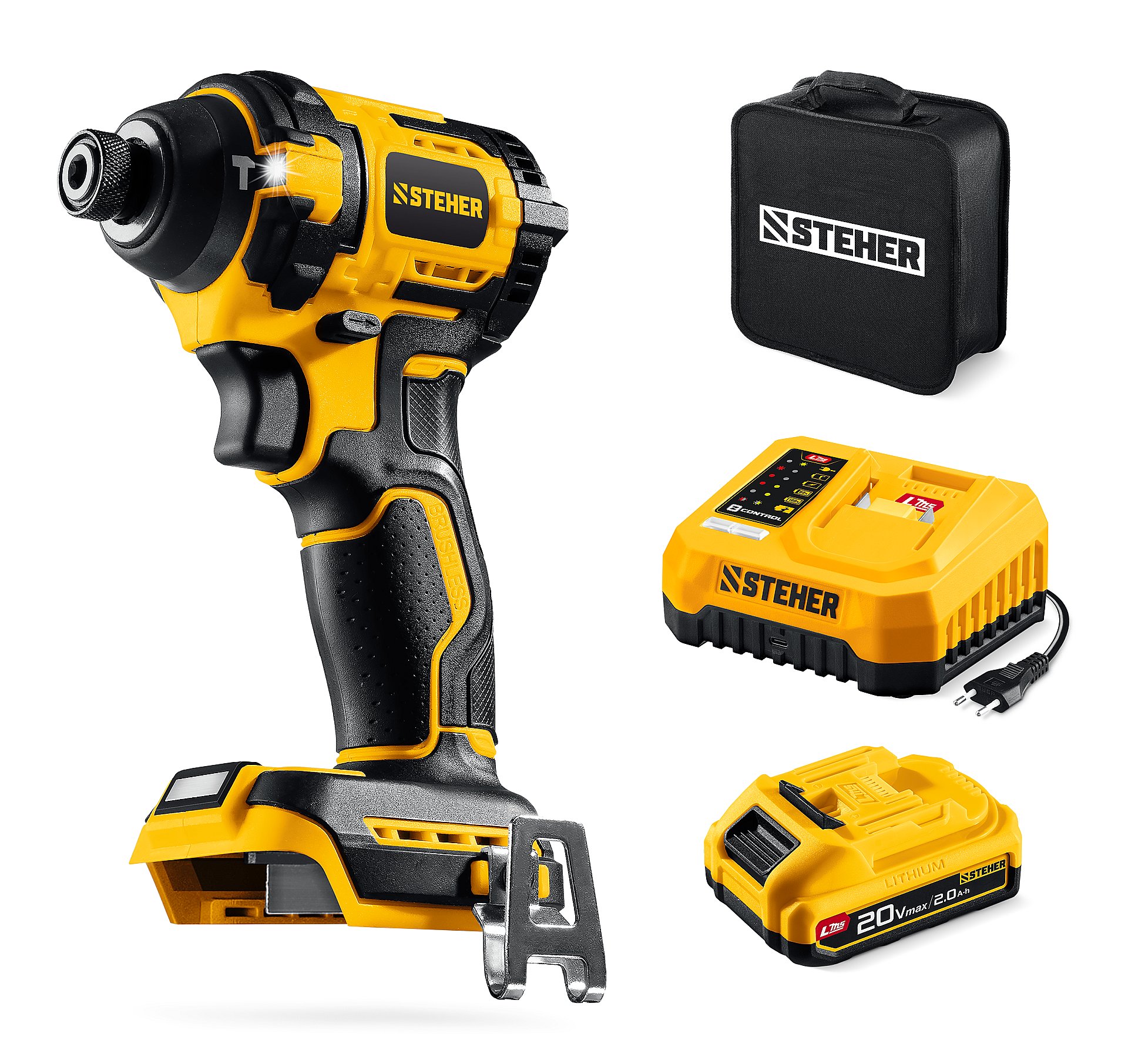 Бесщеточный ударный винтоверт STEHER CSB-180-21, 20 В, 180 Н·м, 1 АКБ LMS (2 А·ч), сумка — предназначен для заворачивания/отворачивания крепежа при сборке и разборке металлических конструкций, снятии и установке колес автомобиля и т.д.