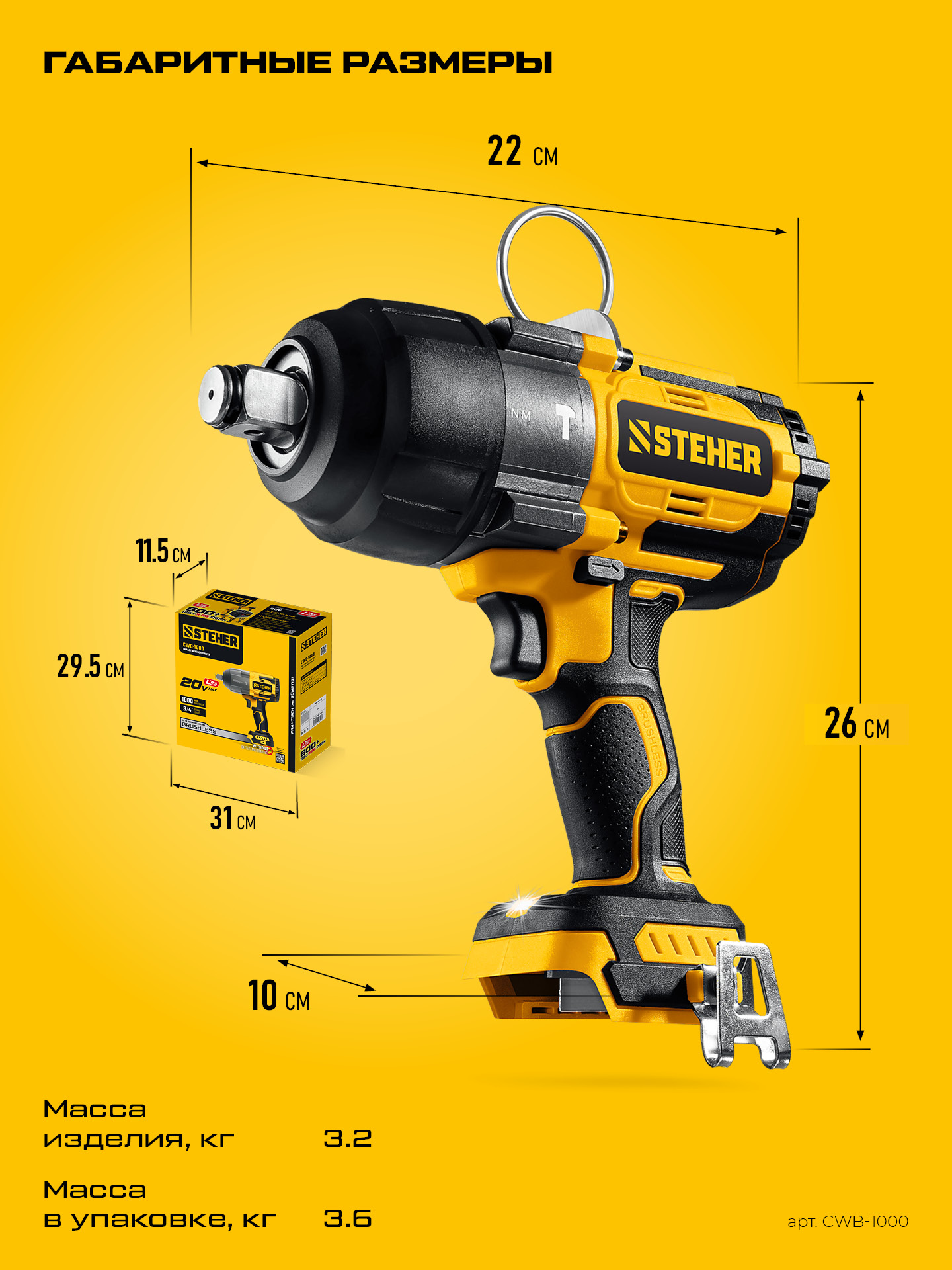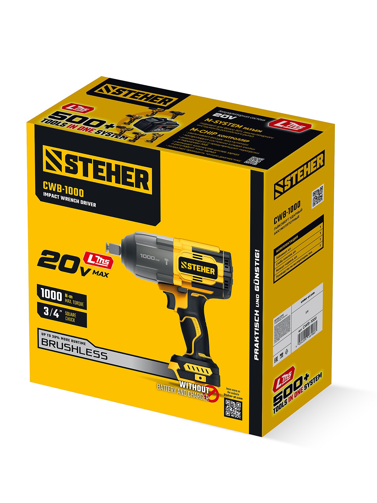 Бесщеточный ударный гайковерт STEHER 20 В, 1000 Н·м, без АКБ (LMS)CWB-1000 - предназначен для заворачивания/отворачивания крепежа (при сборке/разборке металлических конструкций, снятии/установке колес автомобиля и т.д.).