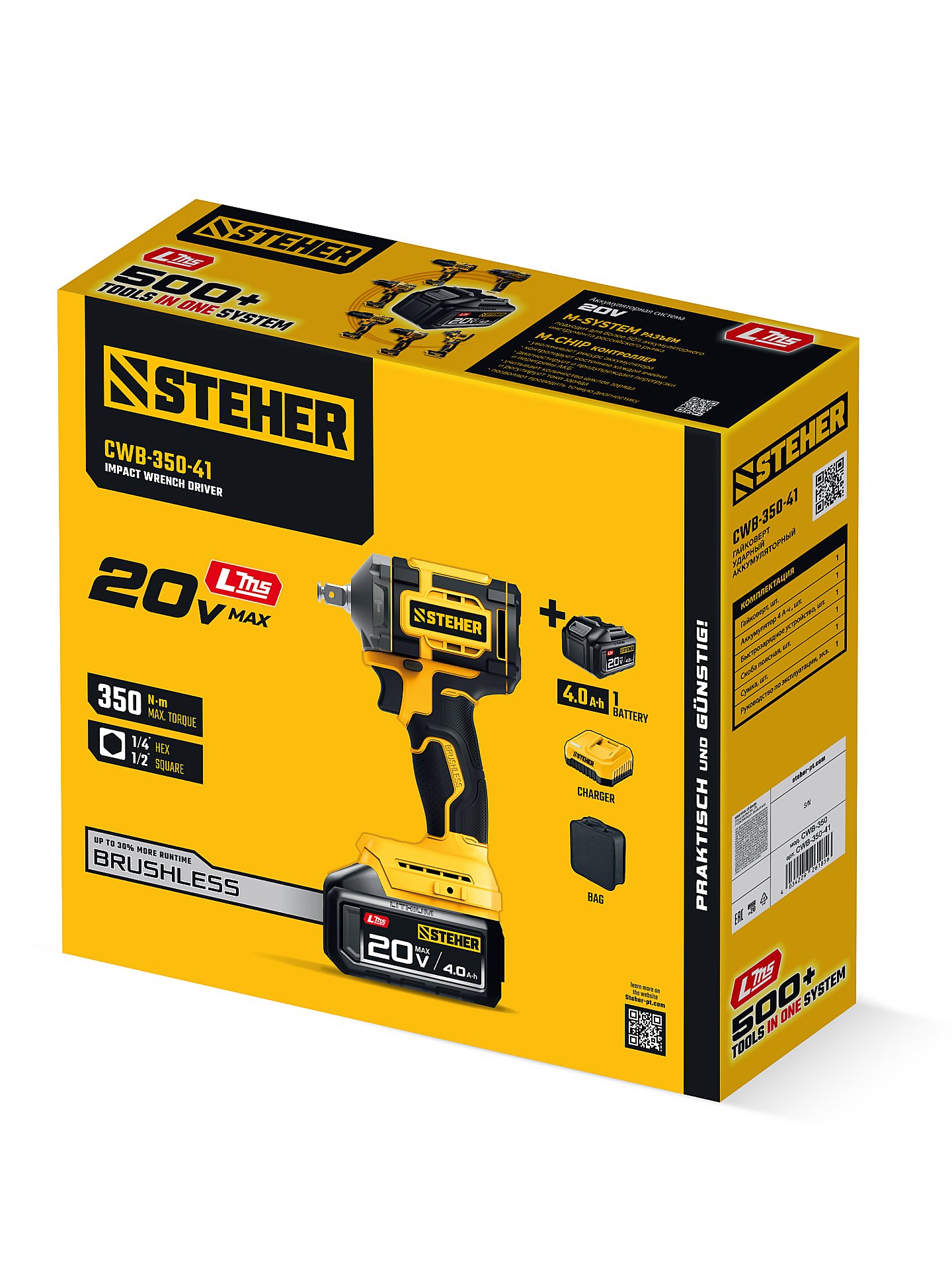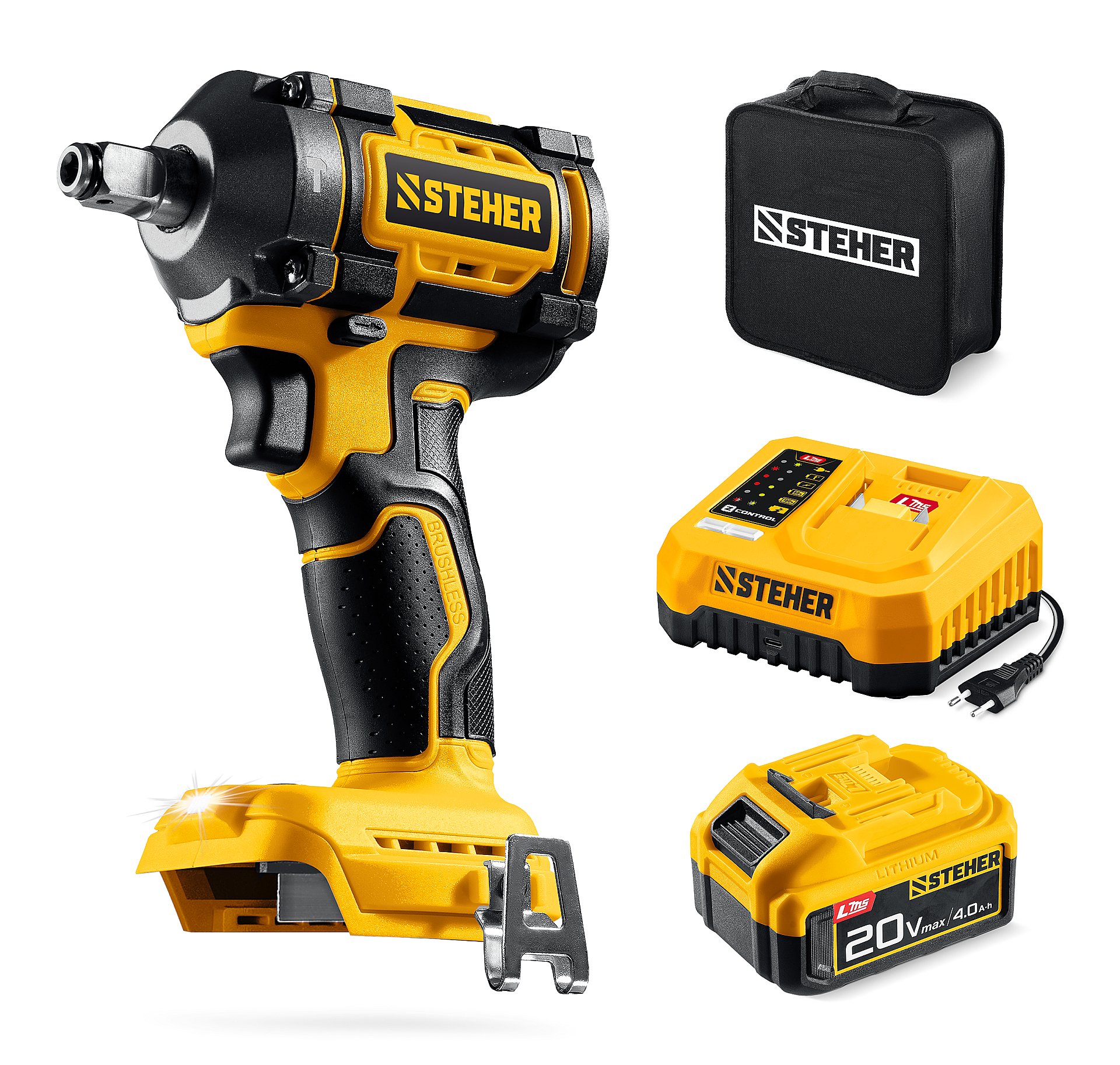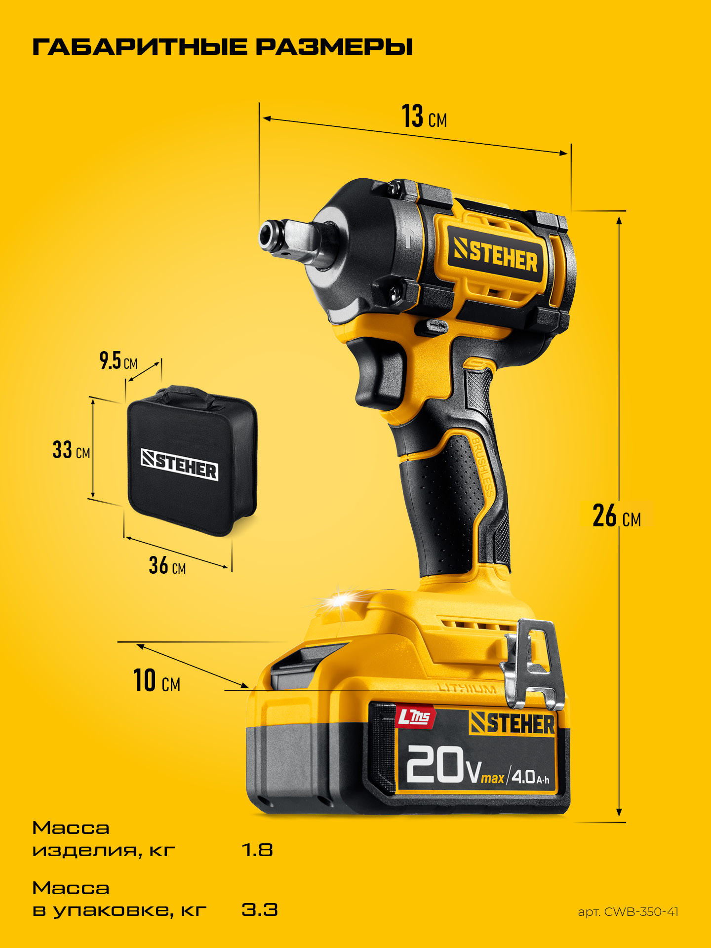 Бесщеточный ударный гайковерт STEHER 20 В, 350 Н·м, 1 АКБ LMS (4 А·ч), сумка CWB-350-41 - предназначен для заворачивания/отворачивания крепежа (при сборке/разборке металлических конструкций, снятии/установке колес автомобиля и т.д.).