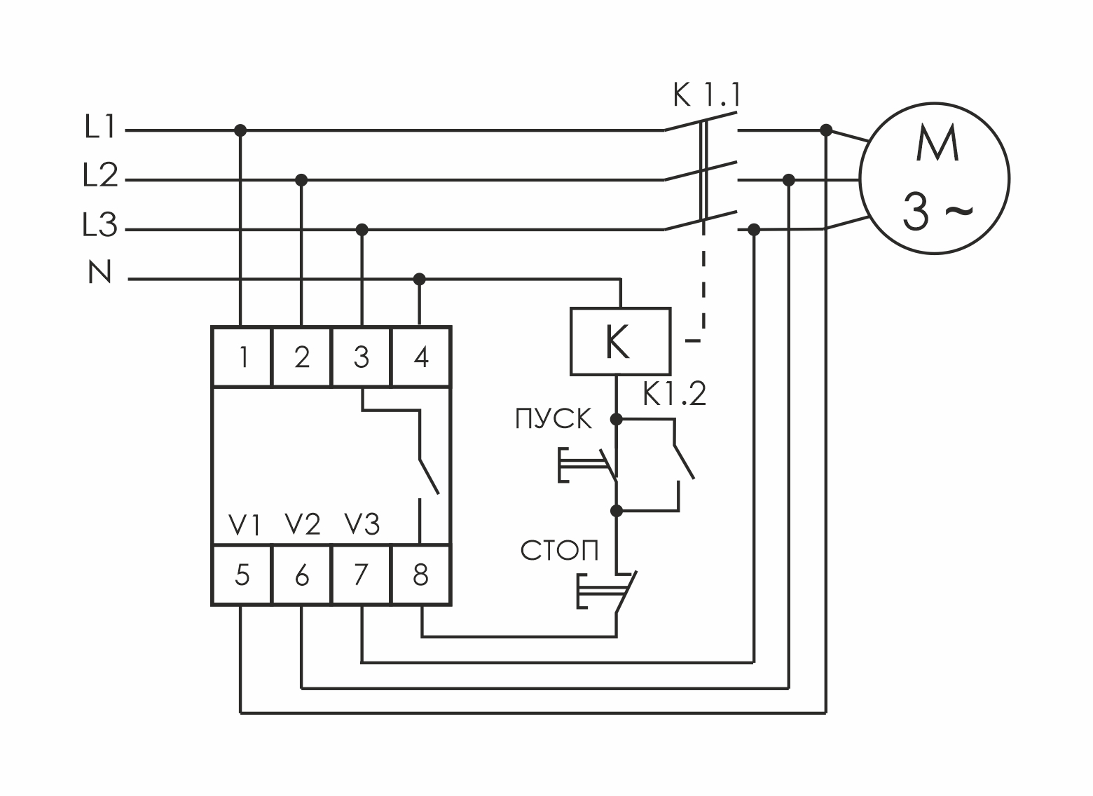 Принцип работы: Если напряжение в пределах нормы, контакты исполнительного реле замкнуты и на контактор управления электродвигателем подается напряжение, управляющее его включением. В случае одной из вышеперечисленных аварийных ситуаций контакты реле размыкаются и контактор отключается. Включение происходит автоматически после восстановления сетевого напряжения питания.