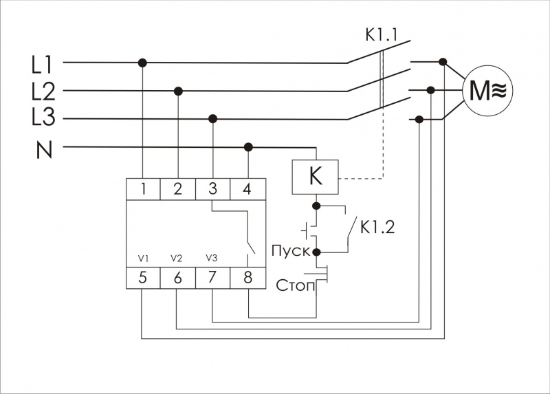 Принцип работы: Если напряжение в пределах нормы, контакты исполнительного реле замкнуты и на контактор управления электродвигателем подается напряжение, управляющее его включением. В случае одной из вышеперечисленных аварийных ситуаций контакты реле размыкаются и контактор отключается. Включение происходит автоматически после восстановления сетевого напряжения питания.