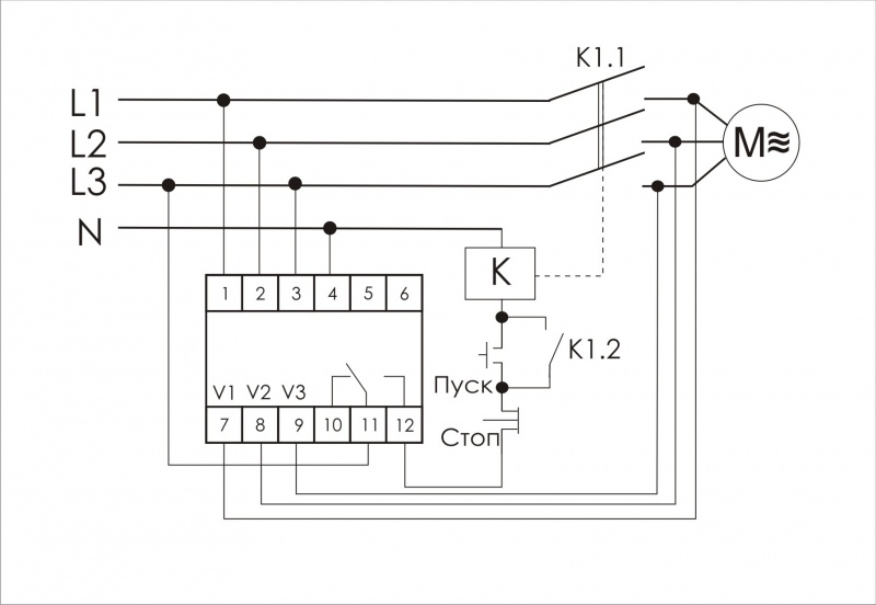 Принцип работы: Если напряжение в пределах нормы, контакты исполнительного реле замкнуты и на контактор управления электродвигателем подается напряжение, управляющее его включением. В случае одной из вышеперечисленных аварийных ситуаций контакты реле размыкаются и контактор отключается. Включение происходит автоматически после восстановления сетевого напряжения питания.