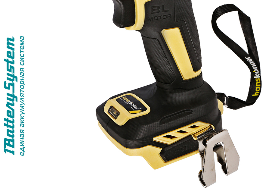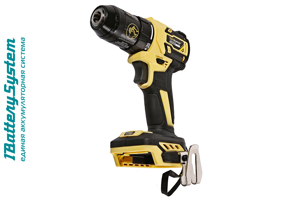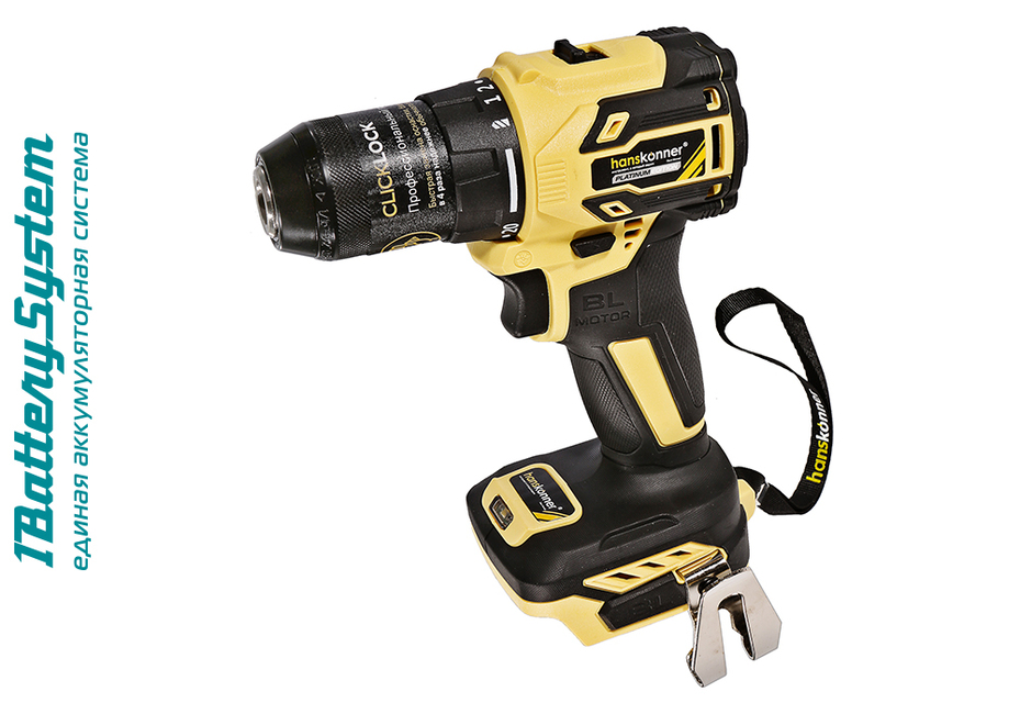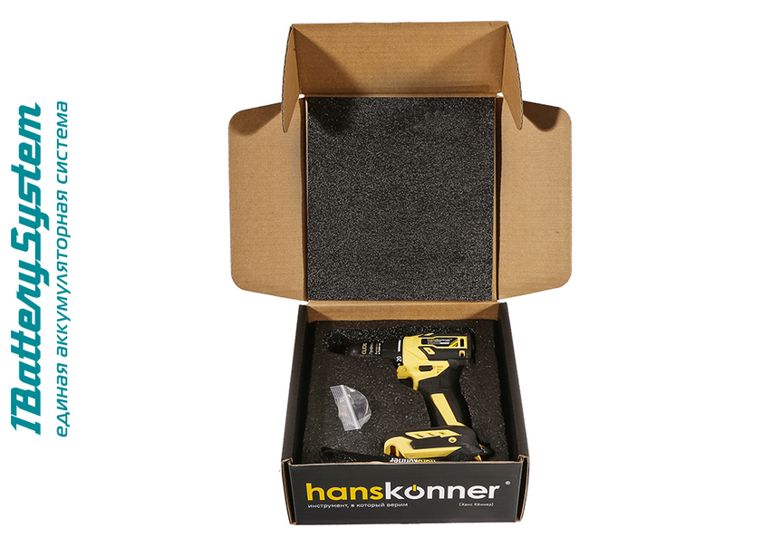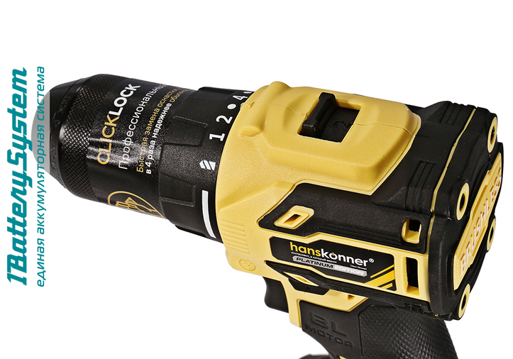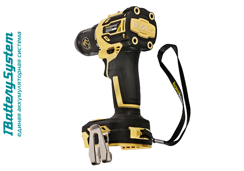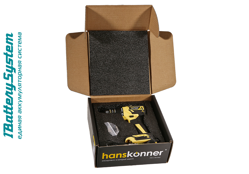 Hanskonner HCD2065BL – аккумуляторный 18 В, двухскоростной шуруповерт – является частью системы 1BatterySystem, обеспечивающей совместимость одного и того же аккумулятора с целым рядом наименований инструмента. Модель обладает максимально сбалансированной компоновкой: небольшая толщина корпуса и рукояти позволяют эффективное использование в условиях с затрудненным доступом, а нейтральный центр тяжести, и обилие прорезиненных противоскользящих поверхностей способствуют надежному хвату, и лучшему контролю в процессе работы. Шуруповерт оснащен 18 В бесщеточным двигателем, характеризующимся на 30% лучшей производительностью в сравнении с коллекторными аналогами. Кроме того, бесщеточный двигатель отлично справляется с кратковременными перегрузками и не склонен к перегреву. Благодаря применению мощного планетарного механизма High Torque Technology, Hanskonner HCD2065BL обладает высоким показателем максимального крутящего момента, достигающего 65 Н м. Имеет две скорости: режим пониженных оборотов (0 – 450 об/мин) предназначен для работ с крепежом, режим повышенных оборотов (0 – 1650 об/мин) – для сверления отверстий в различных материалах. Наличие 20-ти ступенчатой муфты регулировки усилия позволяет производить максимально гибкую настройку необходимого момента затяжки. Усиленный цельнометаллический патрон c муфтой ClickLock и максимальным диаметром захвата 13 мм обеспечивает надежность фиксации, и расширяет набор применяемой оснастки для выполнения работ с повышенной нагрузкой. Предусмотрена функция блокировки вала, способствующая удобству смены оснастки одной рукой. К особенностям Hanskonner HCD2065BL стоит отнести электронный тормоз выбега двигателя, гарантирующий мгновенную остановку патрона, эффективную LED-подсветку рабочей зоны WorkingLight с блоком коллиматорных линз, создающих направленный симметричный луч.