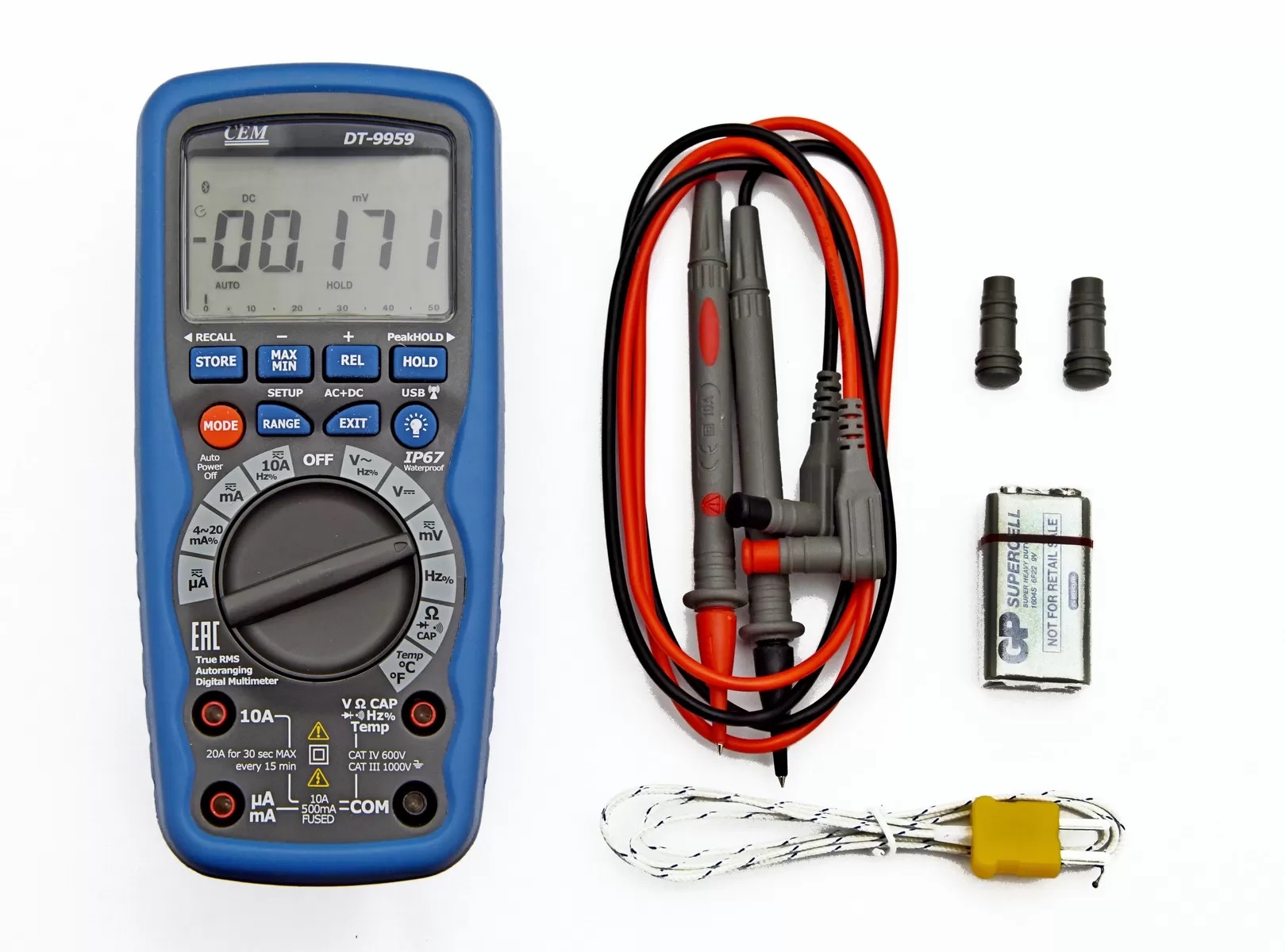 DT-9959 измеряет переменное и постоянное напряжение, переменный и постоянный ток, сопротивление, емкость, частоту (электрическую и электронную), коэффициент заполнения, выполняет контроль исправности диодов, проверку цепи на отсутствие обрыва, измерение температуры с помощью датчика-термопары. Прибор способен записывать и воспроизводить записанные данные на экран, имеет прочный корпус с защитой от проникновения влаги, предназначен для профессионального использования. Мультиметр может передавать данные по беспроводному каналу связи на ПК.