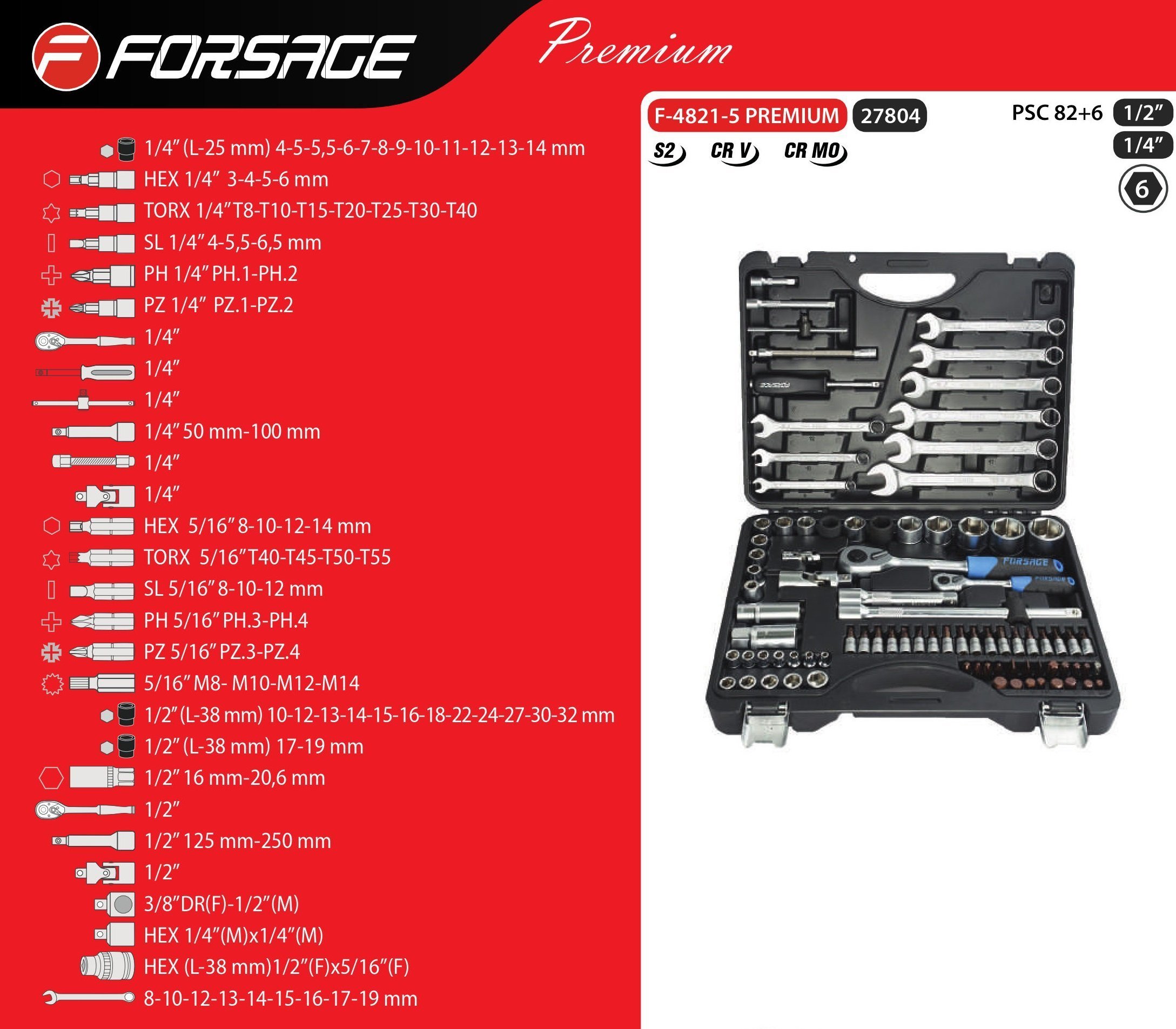 Набор инструментов 82+6пр. Premium 1/4" 1/2 (12гр.) 1/2"(17, 19мм-6гр.) Forsage F-4821-9 PREMIUM - представляет собой обширный комплект, включающий в себя 82 основных элемента, а также дополнительные 6 принадлежностей. Этот набор разработан для широкого спектра ремонтных, монтажных и строительных работ.